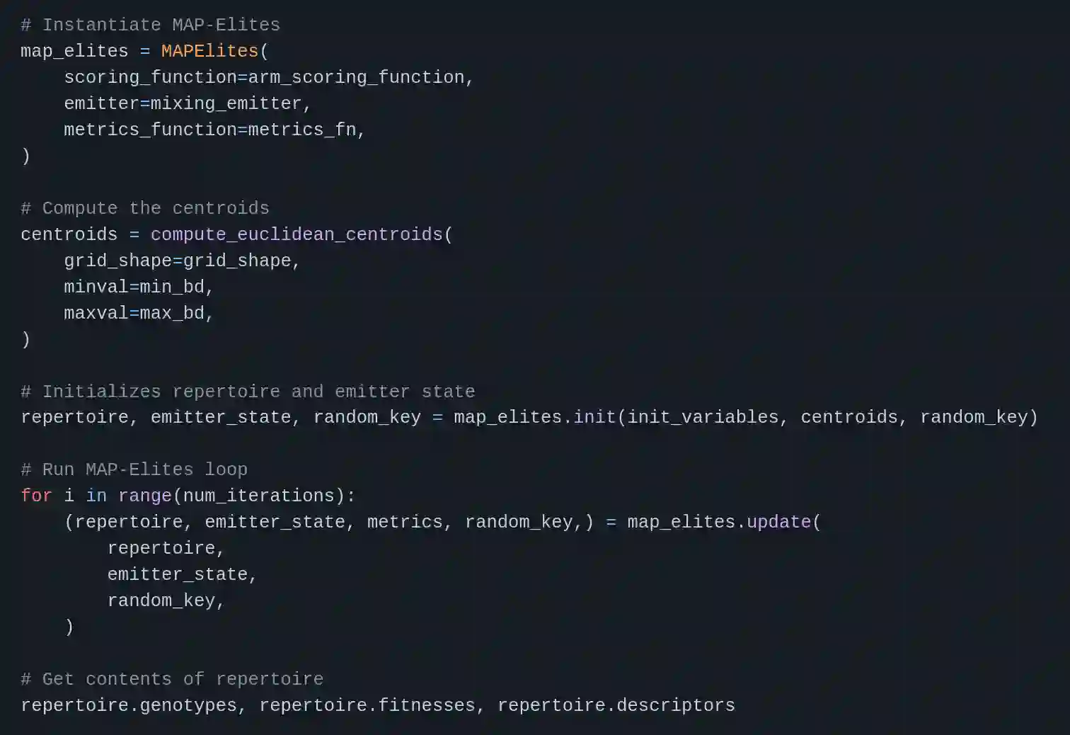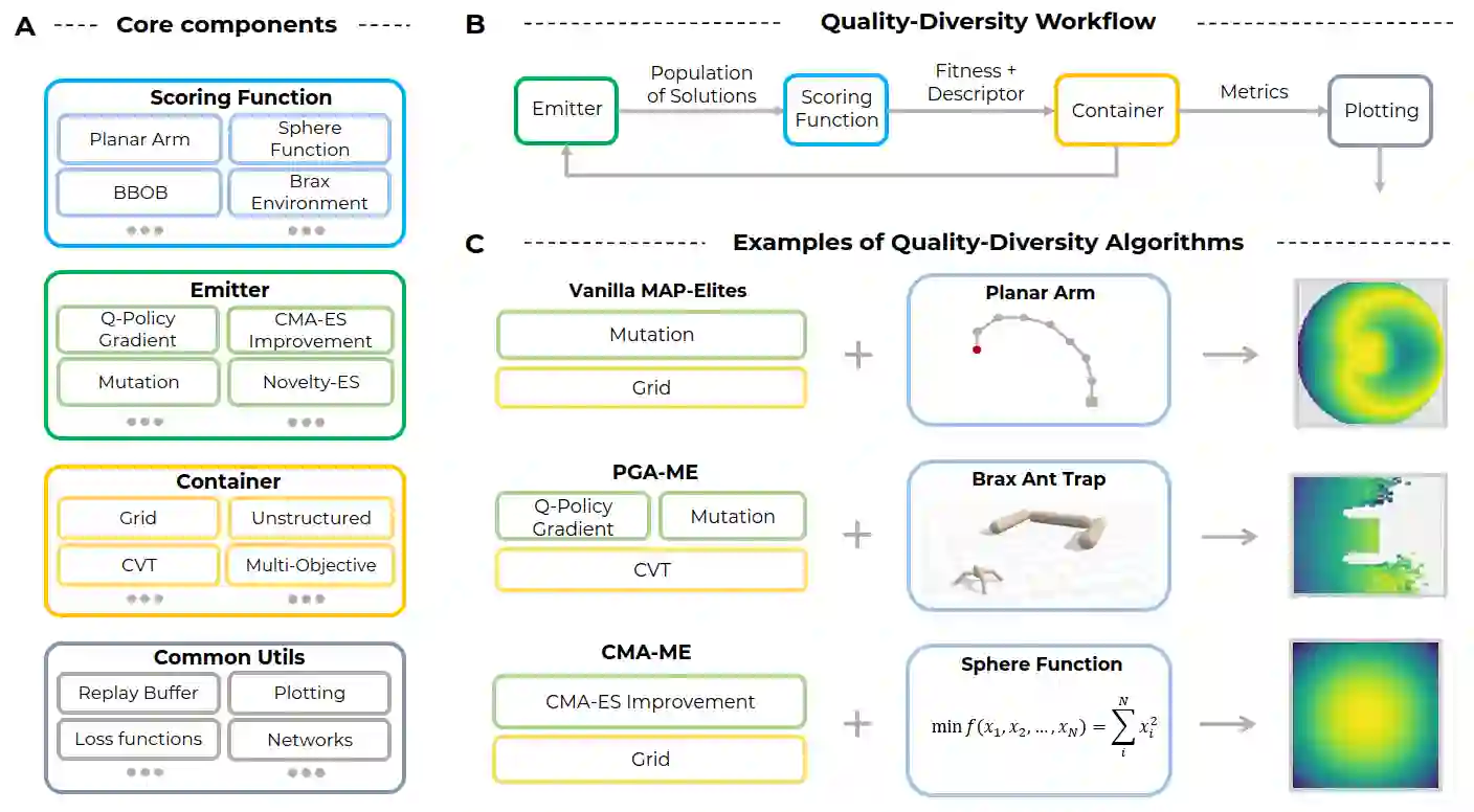 QDax is an open-source library with a streamlined and modular API for Quality-Diversity (QD) optimization algorithms in Jax. The library serves as a versatile tool for optimization purposes, ranging from black-box optimization to continuous control. QDax offers implementations of popular QD, Neuroevolution, and Reinforcement Learning (RL) algorithms, supported by various examples. All the implementations can be just-in-time compiled with Jax, facilitating efficient execution across multiple accelerators, including GPUs and TPUs. These implementations effectively demonstrate the framework's flexibility and user-friendliness, easing experimentation for research purposes. Furthermore, the library is thoroughly documented and tested with 95\% coverage.