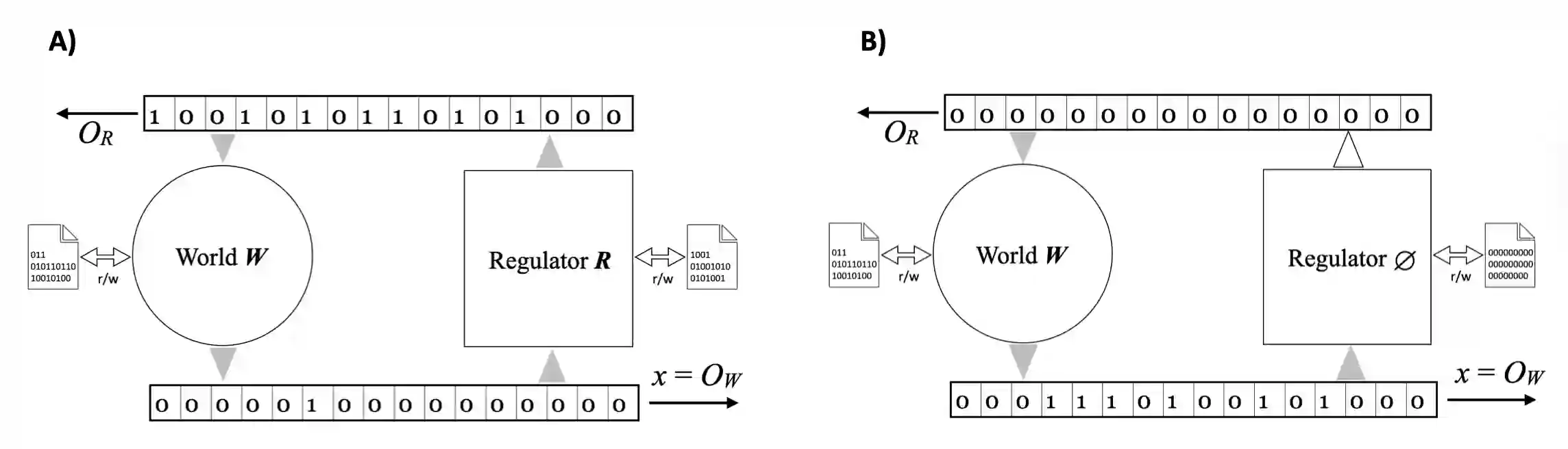 翻译:调节器定理指出,在一定条件下,任何最优控制器都必须包含被调节系统的模型,这奠定了控制器显式或隐式地嵌入被控对象内部模型的思想基础。该原理支撑着神经科学和预测性大脑理论,如自由能原理或柯尔莫哥洛夫/算法智能体理论。然而,该定理仅在有限条件下得到证明。本文通过一个恒定大小的封装程序,将确定性的封闭耦合世界-调节器系统$(W,R)$视为单个自定界程序$p$,该程序产生输入调节器的世界输出字符串$x$。我们从输出的算法复杂性$K(x)$视角分析调节行为。若调节器$R$能相对于无调节基线$\varnothing$降低读数的算法复杂性,即满足\[ \Delta = K\big(O_{W,\varnothing}\big) - K\big(O_{W,R}\big) > 0 \],则定义其为\emph{优良算法调节器}。我们进而证明:$\Delta$越大,具有高互算法信息的世界-调节器对越受青睐。更精确地说,复杂性间隙$\Delta > 0$导致\[ \Pr\big((W,R)\mid x\big) \le C\,2^{\,M(W{:}R)}\,2^{-\Delta} \],使得低$M(W{:}R)$值随$\Delta$增长呈指数级不可信。这是“调节器包含世界模型”思想的算法信息论版本。该框架无需预设分布,适用于个体序列,并与内部模型原理形成互补。超越这一必要性论断,相同的编码定理演算导出了\emph{规范标量目标函数}并隐含了\emph{规划器}的存在。在已实现的交互过程中,调节器的行为\emph{如同}最小化了读数的条件描述长度。