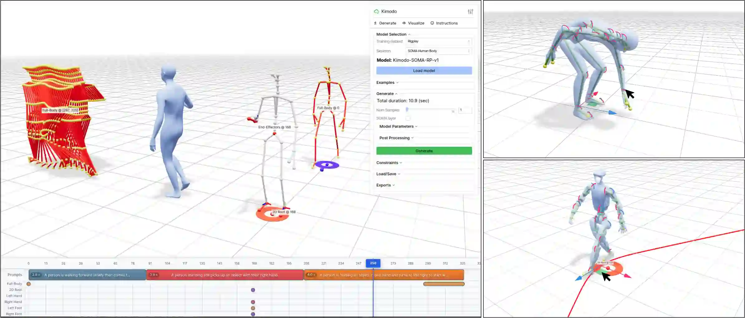 High-quality human motion data is becoming increasingly important for applications in robotics, simulation, and entertainment. Recent generative models offer a potential data source, enabling human motion synthesis through intuitive inputs like text prompts or kinematic constraints on poses. However, the small scale of public mocap datasets has limited the motion quality, control accuracy, and generalization of these models. In this work, we introduce Kimodo, an expressive and controllable kinematic motion diffusion model trained on 700 hours of optical motion capture data. Our model generates high-quality motions while being easily controlled through text and a comprehensive suite of kinematic constraints including full-body keyframes, sparse joint positions/rotations, 2D waypoints, and dense 2D paths. This is enabled through a carefully designed motion representation and two-stage denoiser architecture that decomposes root and body prediction to minimize motion artifacts while allowing for flexible constraint conditioning. Experiments on the large-scale mocap dataset justify key design decisions and analyze how the scaling of dataset size and model size affect performance.