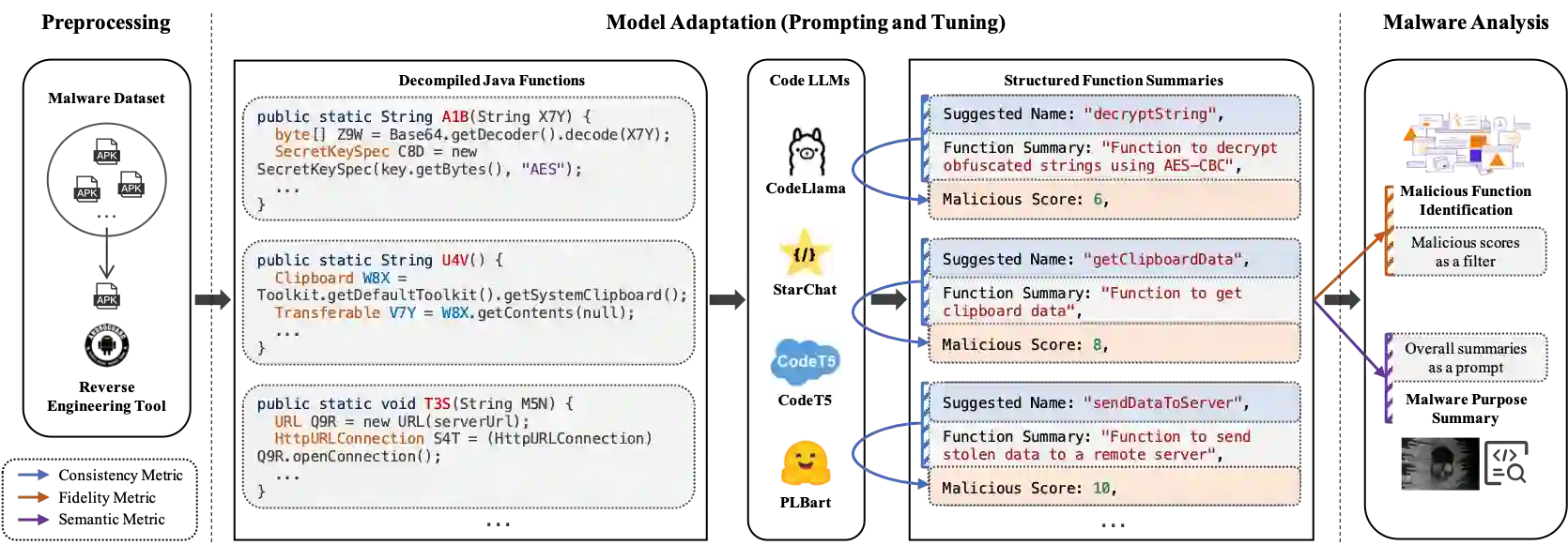 翻译:大语言模型(LLMs)在各种代码智能任务中展现出强大能力。然而,其在安卓恶意软件分析中的有效性尚未得到充分探索。反编译的安卓代码因其庞大的函数数量及频繁缺失有意义的函数名,给分析工作带来了独特挑战。本文提出Cama,一个旨在系统评估代码大语言模型在安卓恶意软件分析任务中有效性的基准测试框架。Cama规定了结构化的模型输出(包括函数摘要、精炼的函数名和恶意性评分),以支持关键的恶意软件分析任务,如恶意函数识别和恶意软件目的摘要。在此基础上,它整合了三个领域特定的评估指标——一致性、保真度和语义相关性,从而能够进行严格的稳定性与有效性评估及跨模型比较。我们构建了一个包含118个安卓恶意软件样本的基准数据集,涵盖超过750万个独立函数,并使用Cama评估了四种流行的开源模型。我们的实验揭示了代码大语言模型如何解释反编译代码,并量化了其对函数重命名的敏感性,同时凸显了代码大语言模型在恶意软件分析任务中的潜力与当前局限。