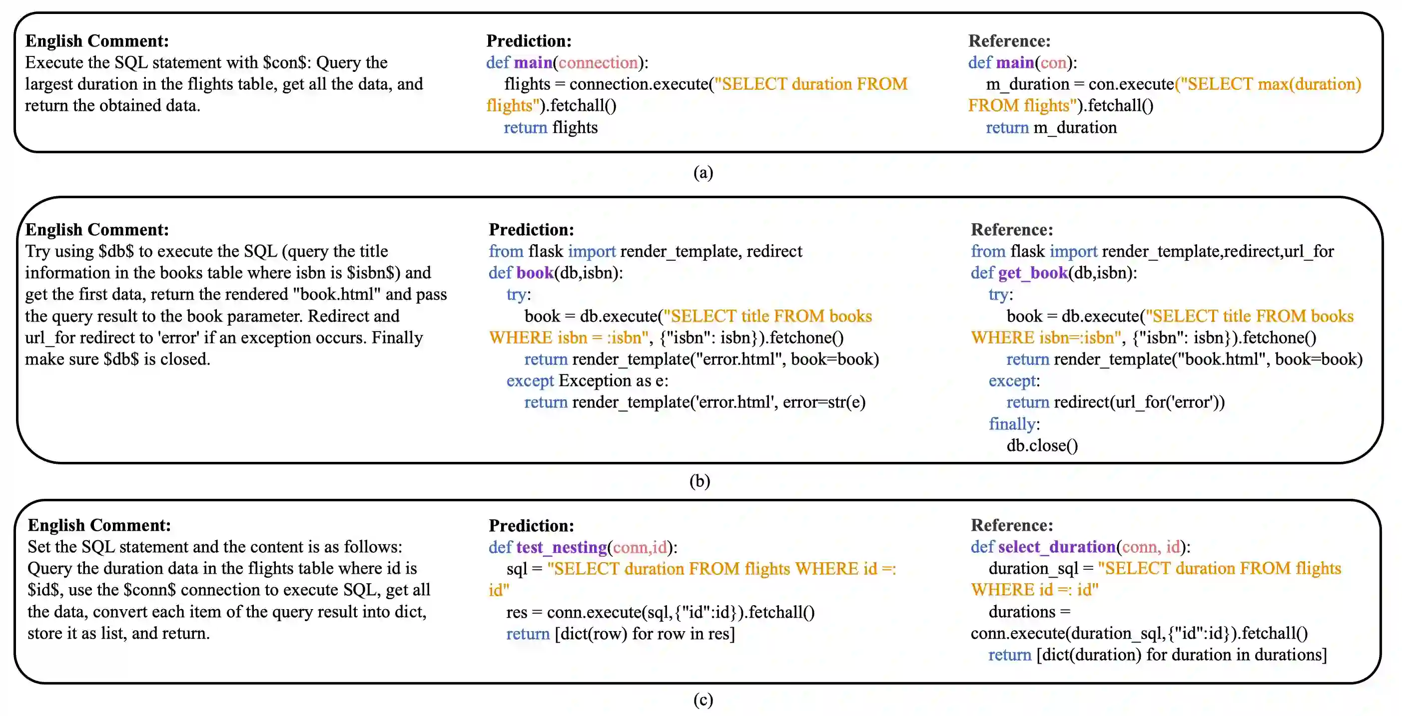 翻译:代码生成对于减少人工软件开发努力至关重要 。 最近, 神经技术已被自动地用于生成源代码 。 虽然这些方法很有希望, 但是这些方法在生成单一编程语言代码的任务中得到了评估 。 但是, 在实际开发中, 一种编程语言往往嵌入另一种语言 。 例如, SQL 语句通常作为字符串嵌在基编程语言中, 如 Python 和 Java, 以及 JavaScript 程序通常嵌入于嵌入于嵌入的 Sython 和 JavaScript 等分层编程语言中 。 这个数据集包含2,000 个由实际使用项目( PHP、 Java 和 Python ) 精心加注的数据库操作程序。 我们在本文件中定义了一个新的代码生成任务: 给出自然语言评论, 任务的目的是以嵌入语言生成一个基础语言的程式。 对于我们的知识来说, 这是首个突变式的代码生成任务 。 。 对于这项任务, 我们使用 最精确的版本, 和最精确的 Ry- prefile 。