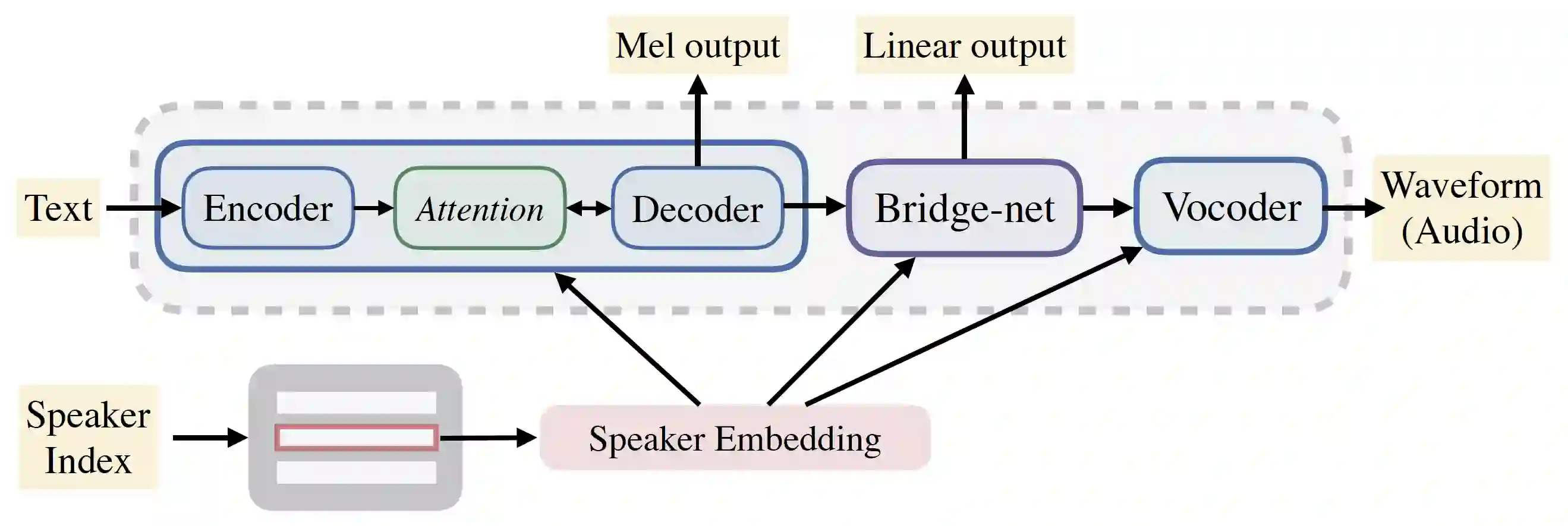 翻译:在这项工作中,我们扩展了ClariNet(Ping等人,2019年),这是一个完全端对端的语音合成模型(即文本到波),以产生多个发言者的高度忠诚的演讲。为模拟不同声音的独特性,在ClariNet的每个组成部分中共享低维可训练的演讲器嵌入,并与该模型的其余部分一起培训。我们证明,在自然性方面,多发式的ClariNet在多发式上优于最先进的系统,因为整个模型以端对端的方式共同优化。