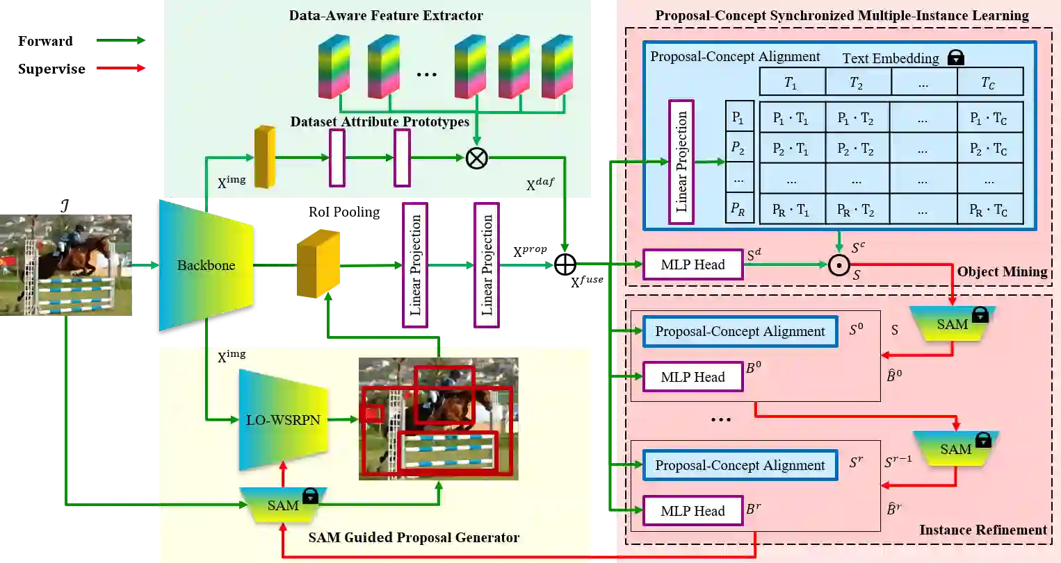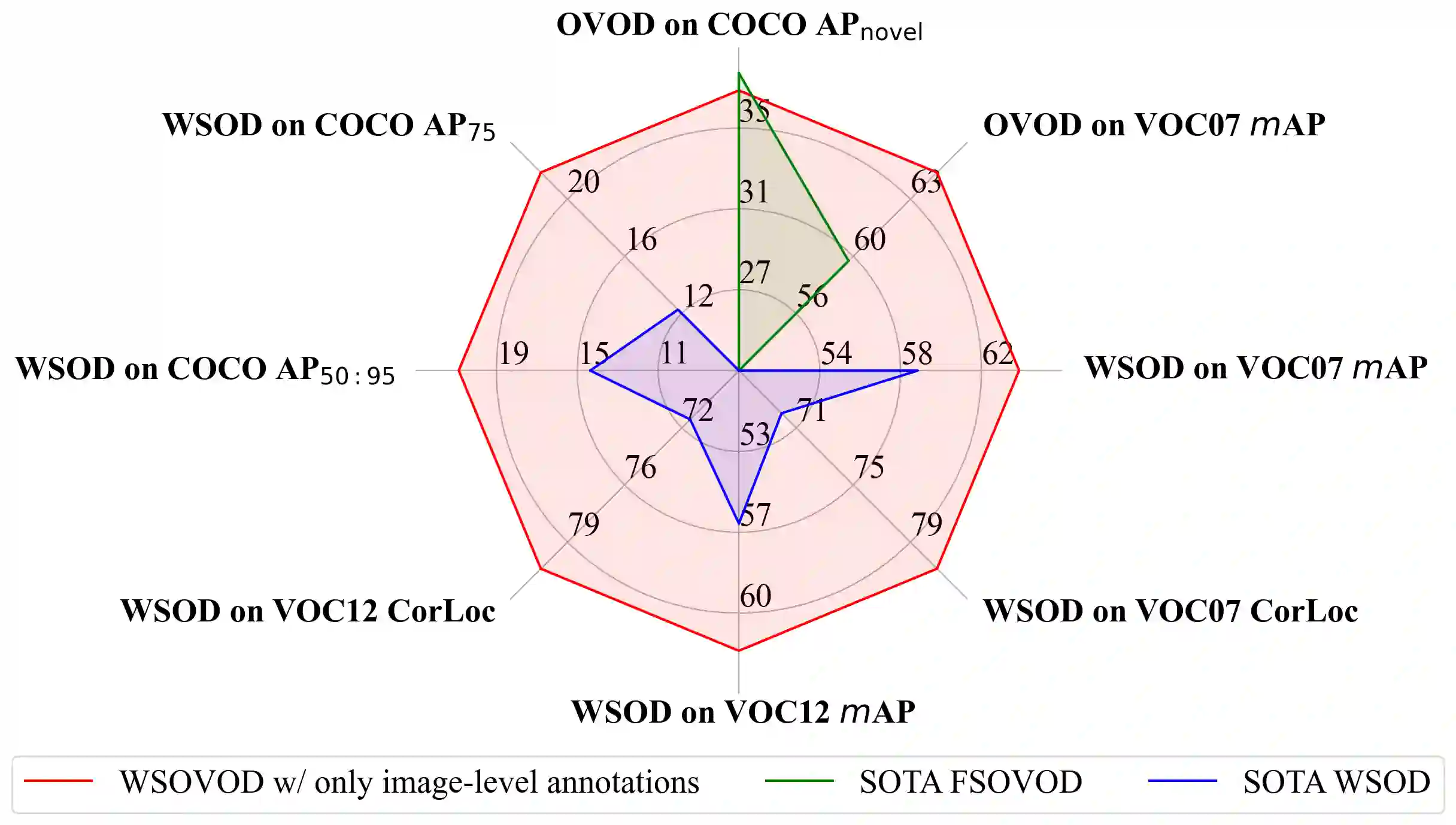 Despite weakly supervised object detection (WSOD) being a promising step toward evading strong instance-level annotations, its capability is confined to closed-set categories within a single training dataset. In this paper, we propose a novel weakly supervised open-vocabulary object detection framework, namely WSOVOD, to extend traditional WSOD to detect novel concepts and utilize diverse datasets with only image-level annotations. To achieve this, we explore three vital strategies, including dataset-level feature adaptation, image-level salient object localization, and region-level vision-language alignment. First, we perform data-aware feature extraction to produce an input-conditional coefficient, which is leveraged into dataset attribute prototypes to identify dataset bias and help achieve cross-dataset generalization. Second, a customized location-oriented weakly supervised region proposal network is proposed to utilize high-level semantic layouts from the category-agnostic segment anything model to distinguish object boundaries. Lastly, we introduce a proposal-concept synchronized multiple-instance network, i.e., object mining and refinement with visual-semantic alignment, to discover objects matched to the text embeddings of concepts. Extensive experiments on Pascal VOC and MS COCO demonstrate that the proposed WSOVOD achieves new state-of-the-art compared with previous WSOD methods in both close-set object localization and detection tasks. Meanwhile, WSOVOD enables cross-dataset and open-vocabulary learning to achieve on-par or even better performance than well-established fully-supervised open-vocabulary object detection (FSOVOD).