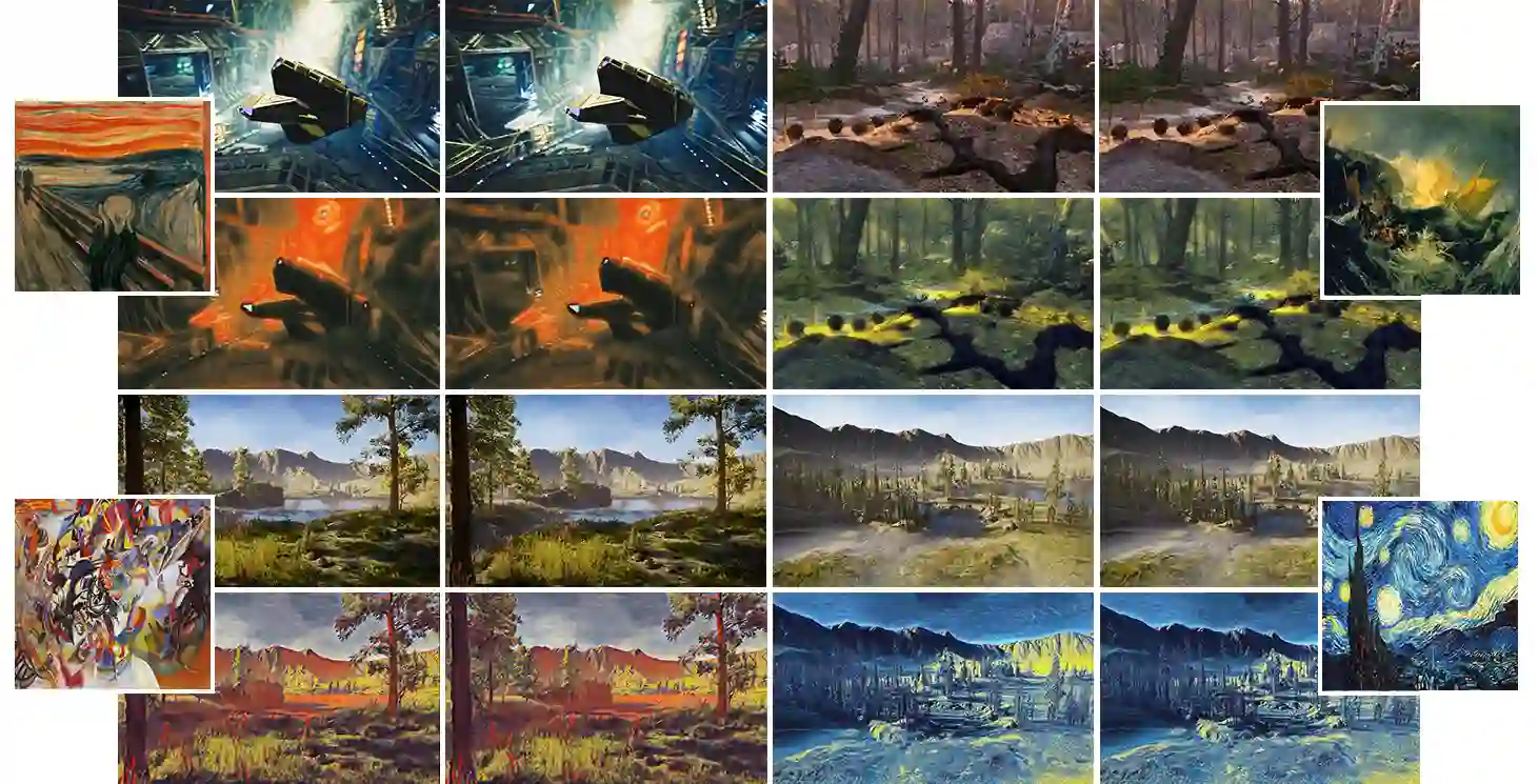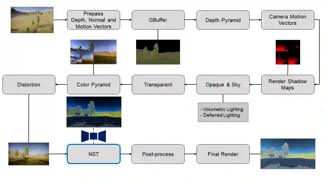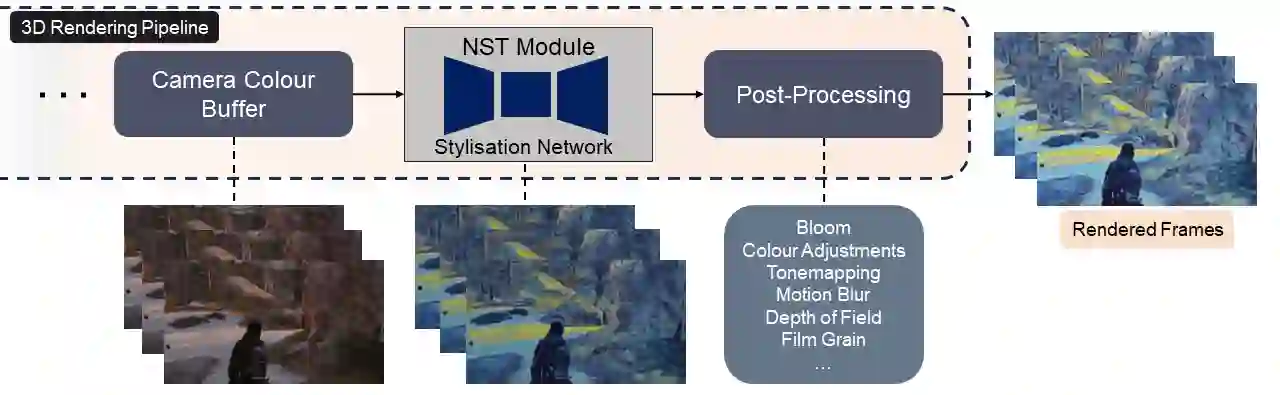Neural Style Transfer (NST) research has been applied to images, videos, 3D meshes and radiance fields, but its application to 3D computer games remains relatively unexplored. Whilst image and video NST systems can be used as a post-processing effect for a computer game, this results in undesired artefacts and diminished post-processing effects. Here, we present an approach for injecting depth-aware NST as part of the 3D rendering pipeline. Qualitative and quantitative experiments are used to validate our in-game stylisation framework. We demonstrate temporally consistent results of artistically stylised game scenes, outperforming state-of-the-art image and video NST methods.