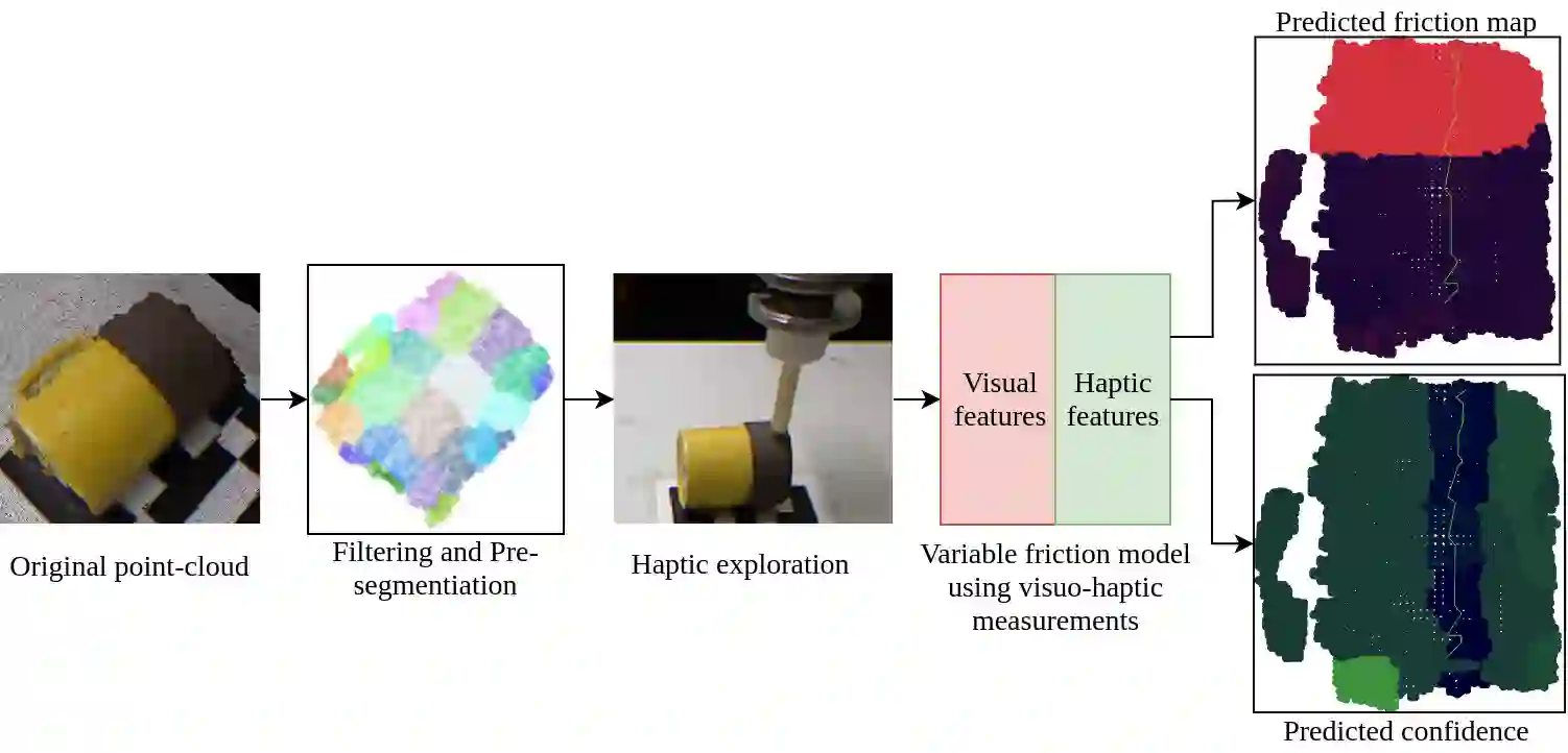 Accurately modeling local surface properties of objects is crucial to many robotic applications, from grasping to material recognition. Surface properties like friction are however difficult to estimate, as visual observation of the object does not convey enough information over these properties. In contrast, haptic exploration is time consuming as it only provides information relevant to the explored parts of the object. In this work, we propose a joint visuo-haptic object model that enables the estimation of surface friction coefficient over an entire object by exploiting the correlation of visual and haptic information, together with a limited haptic exploration by a robotic arm. We demonstrate the validity of the proposed method by showing its ability to estimate varying friction coefficients on a range of real multi-material objects. Furthermore, we illustrate how the estimated friction coefficients can improve grasping success rate by guiding a grasp planner toward high friction areas.