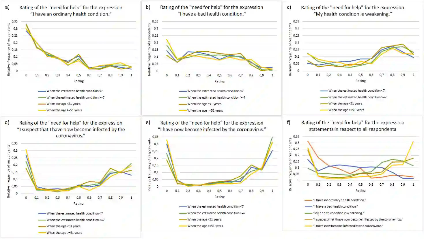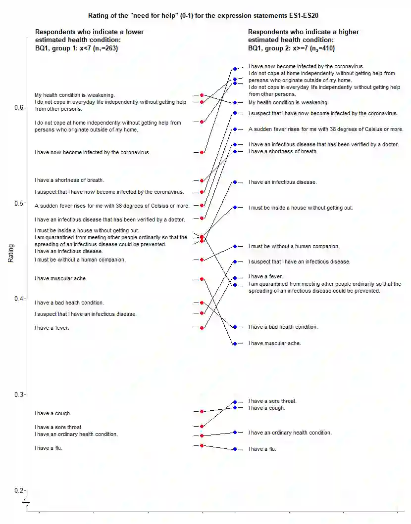 Developing machine learning models to support health analytics requires increased understanding about statistical properties of self-rated expression statements. We analyzed self-rated expression statements concerning the coronavirus COVID-19 epidemic to identify statistically significant differences between groups of respondents and to detect the patient's need for help with machine learning. Our quantitative study gathered the "need for help" ratings for twenty health-related expression statements concerning the coronavirus epidemic on a 11-point Likert scale, and nine answers about the person's health and wellbeing, sex and age. Online respondents between 30 May and 3 August 2020 were recruited from Finnish patient and disabled people's organizations, other health-related organizations and professionals, and educational institutions (n=673). We analyzed rating differences and dependencies with Kendall rank-correlation and cosine similarity measures and tests of Wilcoxon rank-sum, Kruskal-Wallis and one-way analysis of variance (ANOVA) between groups, and carried out machine learning experiments with a basic implementation of a convolutional neural network algorithm. We found statistically significant correlations and high cosine similarity values between various health-related expression statement pairs concerning the "need for help" ratings and a background question pair. We also identified statistically significant rating differences for several health-related expression statements in respect to groupings based on the answer values of background questions, such as the ratings of suspecting to have the coronavirus infection and having it depending on the estimated health condition, quality of life and sex. Our experiments with a convolutional neural network algorithm showed the applicability of machine learning to support detecting the need for help in the patient's expressions.