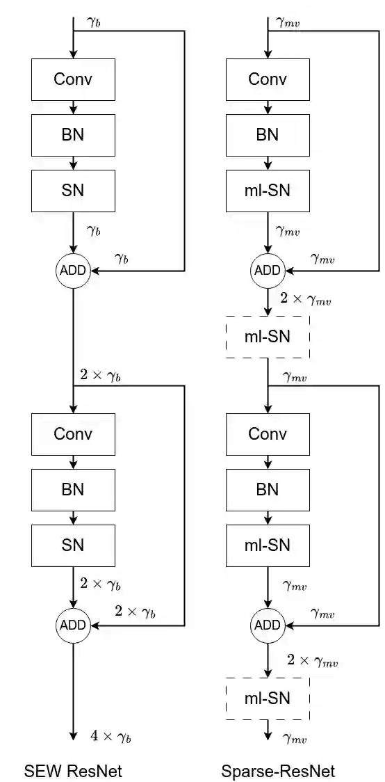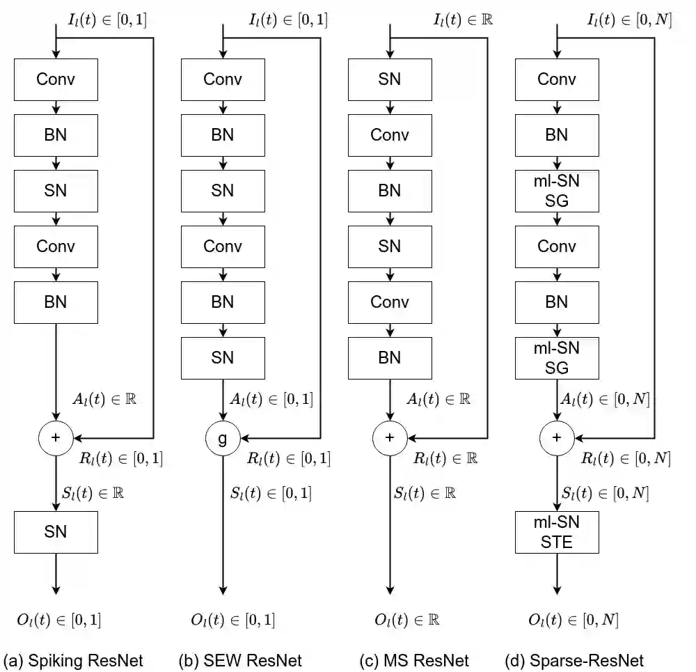 翻译:脉冲神经网络(SNNs)是最具前景的生物启发神经网络模型之一,近年来受到越来越多的关注。SNNs的事件驱动通信机制使其能够在专用神经形态硬件上实现稀疏且理论上低功耗的操作。然而,瞬时脉冲的二元特性也导致SNNs存在显著的信息损失,进而造成精度下降。为解决这一问题,我们提出了一种多级脉冲神经元模型,能够在接近全精度人工神经网络(ANNs)性能的同时,提供低量化误差和最小推理延迟。基于流行网络架构和数据集的实验结果表明,多级脉冲神经元提供了更好的信息压缩能力,从而可在不损失性能的情况下降低延迟。在图像分类场景中,与二元SNNs相比,多级SNNs根据量化间隔数量的不同,可将能耗降低2至3倍。在神经形态数据上,我们的方法能够将推理延迟大幅缩减至1个时间步,相当于相比已发表结果实现了10倍的压缩因子。在架构层面,我们提出了一种新的残差架构,称为稀疏残差网络(Sparse-ResNet)。通过对残差连接中脉冲传播的细致分析,我们揭示了一种影响多数脉冲残差架构的脉冲雪崩效应。采用我们的稀疏残差网络架构,我们能够在图像分类任务中取得最先进的精度结果,同时相比之前的脉冲残差网络减少超过20%的网络活动。