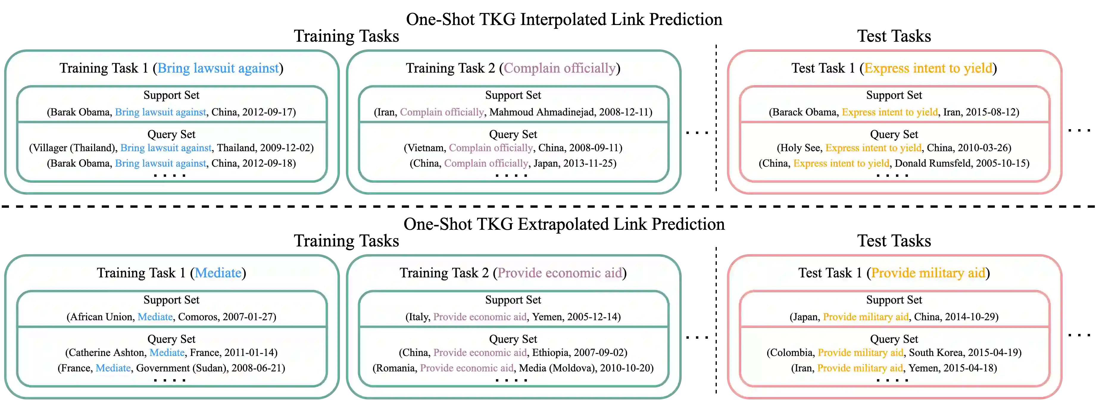 Few-shot relational learning for static knowledge graphs (KGs) has drawn greater interest in recent years, while few-shot learning for temporal knowledge graphs (TKGs) has hardly been studied. Compared to KGs, TKGs contain rich temporal information, thus requiring temporal reasoning techniques for modeling. This poses a greater challenge in learning few-shot relations in the temporal context. In this paper, we follow the previous work that focuses on few-shot relational learning on static KGs and extend two fundamental TKG reasoning tasks, i.e., interpolated and extrapolated link prediction, to the one-shot setting. We propose four new large-scale benchmark datasets and develop a TKG reasoning model for learning one-shot relations in TKGs. Experimental results show that our model can achieve superior performance on all datasets in both TKG link prediction tasks.
