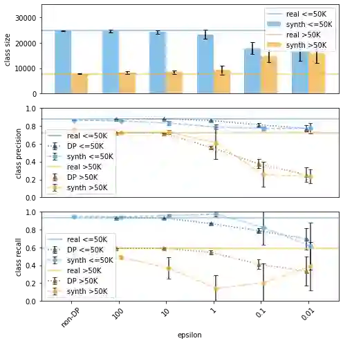 翻译:使用不同隐私(DP)培训的生成模型越来越多地用于以方便隐私的方式制作和分享合成数据。在本文中,我们准备分析DP对这些模型相对于代表性不足的数据类别和分组的影响。我们从两个角度分析DP对这些模型的影响:1) 合成数据中的类别和分组规模,2) 分类准确性。我们还评估了不同程度的不平衡和隐私预算的影响。我们使用三种最先进的DP模型(PrivBayes、DP-WGAN和PATE-GAN)进行的实验表明,DP的结果在生成的合成数据中出现不同大小的分布。更准确地说,它影响到多数类和少数类和分组之间的差距,要么缩小(Robin Hood效应),要么增加(“Mathew”效应)。然而,这两种规模的变化都会导致对分类者准确性产生类似的不同影响,对数据代表性过大的子部分影响。结果,我们呼吁在分析或培训合成数据模型时谨慎对待不同次层的风险,因为后者可能会导致不可靠的。