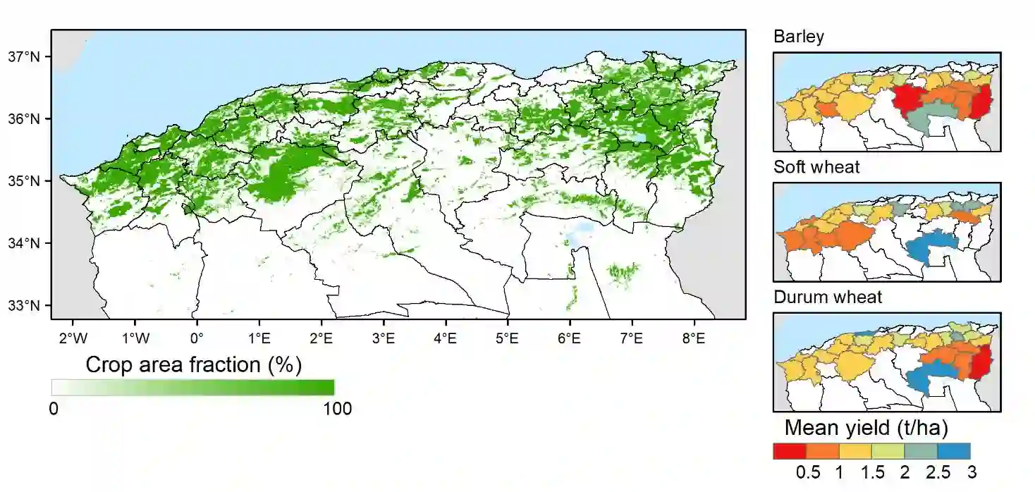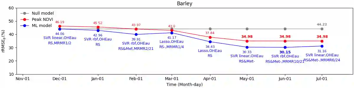 翻译:预测作物产量对于粮食安全非常重要,特别是对于预测作物产量可能下降的地点非常重要。气候记录和遥感数据已成为作物产量预测系统的数据的有用来源。同样,机器学习方法也越来越多地用于处理大型地球观测数据。然而,在缺乏粮食安全的国家,为培训此类算法而获得必要数据的机会往往有限。在这里,我们评估机器学习算法和小数据的业绩,以预测从开始到生长季节结束的每个月的产量。为了做到这一点,我们开发了一个强大和自动化的机器学习管道,选择了最佳特征和模型用于预测。在阿尔及利亚进行案例研究时,我们经常以0.16-0.2吨/公顷(平均产量13.4%)的准确度预测大麦、软小麦和杜鲁麦的国家产量。最好的机器学习模型总是比简单的基准模型要好得多。此外,基准模型的精确度差异并不总是具有实际意义。此外,基准模型的精确度通常高于60 % 平均产量(平均产量的134% ) (平均产量) (平均产量的13-14 % ) 预测模型的精确度) 之后,机器学习模型的精确度的精确度比重度比重 。 模型的精确度的精确度的精确度的精确度的精确度比重比重模型的模型的精确度比重于60 。在机器的模型的精确度的模型的精确度的精确度的精确度的精确度的精确度的精确度的模型的比比比重度的模型的比重度的精确度的精确度的精确度的比比比比比比重 。在机器的模型的模型的精确度的精确度的精确度的精确度的精确度比比重在机器的模型的精确度的精确度的精确度的精确度的模型的比比比比比比比比比比比重, 。
