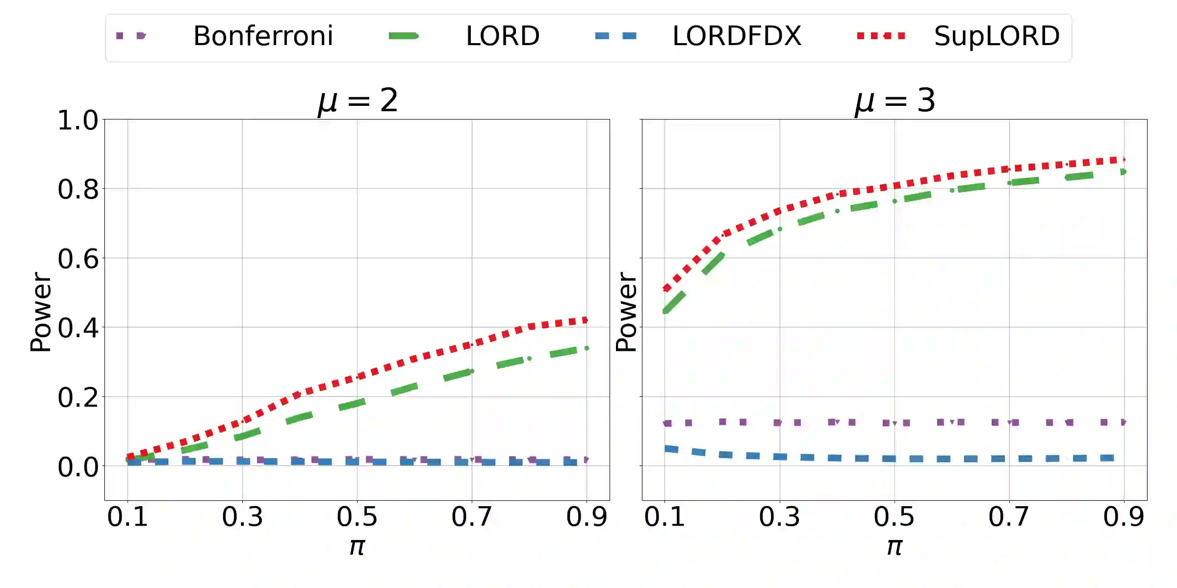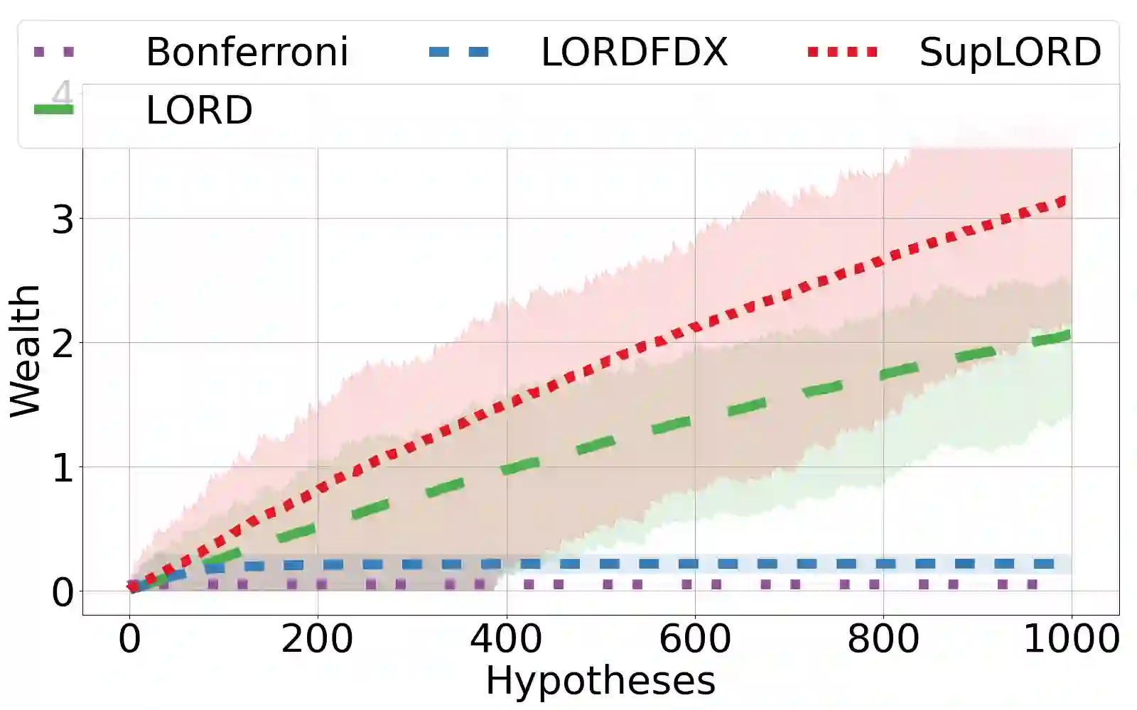 翻译:我们为在线多次测试推出新的算法,这些算法可以控制虚假的发现超量(FDX),同时取得比以往方法更大的能量级。这种统计进步是由新的算法理念的发展促成的:早期算法更“静态”而我们的新算法允许根据算法积累的财富量动态调整测试水平。我们证明我们的算法在各种合成实验中获得了更高的能量。我们还证明SupLORD可以为FDR和FDX提供错误控制,并在停止时控制FDR。 停止时间特别重要,因为它们允许实验者在保持对FDR的预期控制的同时尽早任意结束实验。 SupLORD是第一个在网络设置的停止时间控制FDR的非三轨算法,据我们所知,它是第一个能够控制FDR的在线设置中的非三角算法。