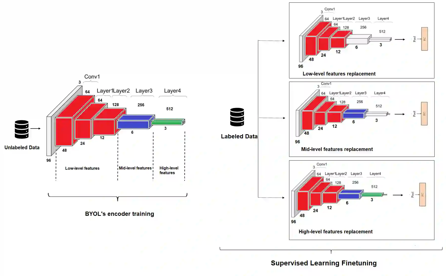Supervised learning can learn large representational spaces, which are crucial for handling difficult learning tasks. However, due to the design of the model, classical image classification approaches struggle to generalize to new problems and new situations when dealing with small datasets. In fact, supervised learning can lose the location of image features which leads to supervision collapse in very deep architectures. In this paper, we investigate how self-supervision with strong and sufficient augmentation of unlabeled data can train effectively the first layers of a neural network even better than supervised learning, with no need for millions of labeled data. The main goal is to disconnect pixel data from annotation by getting generic task-agnostic low-level features. Furthermore, we look into Vision Transformers (ViT) and show that the low-level features derived from a self-supervised architecture can improve the robustness and the overall performance of this emergent architecture. We evaluated our method on one of the smallest open-source datasets STL-10 and we obtained a significant boost of performance from 41.66% to 83.25% when inputting low-level features from a self-supervised learning architecture to the ViT instead of the raw images.