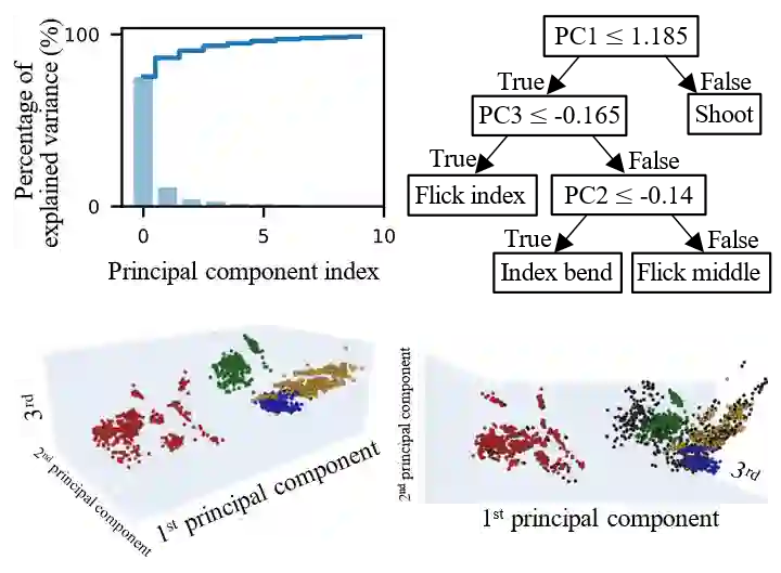 Automated hand gesture recognition has been a focus of the AI community for decades. Traditionally, work in this domain revolved largely around scenarios assuming the availability of the flow of images of the user hands. This has partly been due to the prevalence of camera-based devices and the wide availability of image data. However, there is growing demand for gesture recognition technology that can be implemented on low-power devices using limited sensor data instead of high-dimensional inputs like hand images. In this work, we demonstrate a hand gesture recognition system and method that uses signals from capacitive sensors embedded into the etee hand controller. The controller generates real-time signals from each of the wearer five fingers. We use a machine learning technique to analyse the time series signals and identify three features that can represent 5 fingers within 500 ms. The analysis is composed of a two stage training strategy, including dimension reduction through principal component analysis and classification with K nearest neighbour. Remarkably, we found that this combination showed a level of performance which was comparable to more advanced methods such as supervised variational autoencoder. The base system can also be equipped with the capability to learn from occasional errors by providing it with an additional adaptive error correction mechanism. The results showed that the error corrector improve the classification performance in the base system without compromising its performance. The system requires no more than 1 ms of computing time per input sample, and is smaller than deep neural networks, demonstrating the feasibility of agile gesture recognition systems based on this technology.