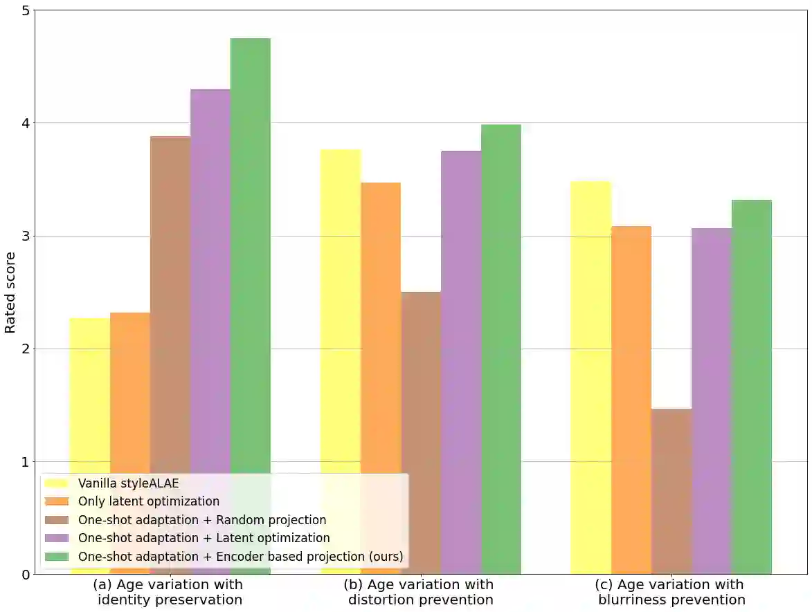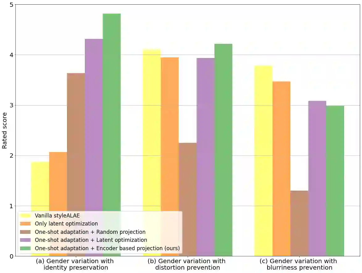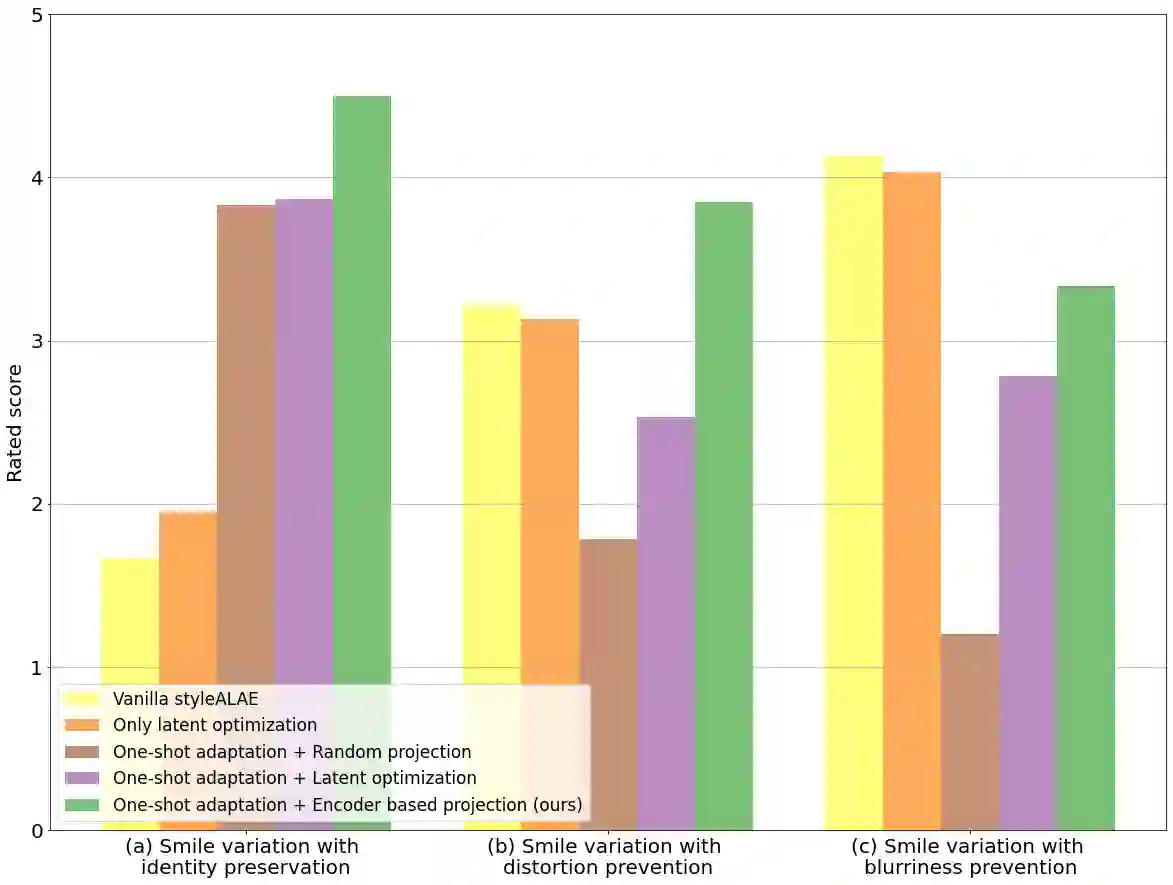 翻译:真实世界面部图像的语义面部编辑是基因模型的一个重要应用。 最近,多部作品探索了利用预先训练过的GAN模型的潜在结构进行这种修改的可能技术。 但是,这类方法往往需要培训编码器网络,通常是一个耗时和资源密集的过程。 以GAN为基础的结构的一个可能的替代方法可以是StyALAE,一个基于潜空的自动编码器,可以生成高质量的照片现实图像。 不幸的是,SysteALAE中重建后的图像无法保存输入面部图像的特性。这限制了StyALE用于对已知身份图像的语义面部编辑的应用。 在我们的工作中,我们利用最近的一次性域适应进展来解决这个问题。我们的工作确保重建后的图像的特性与给定的输入图像相同。我们还利用预先训练过的SyALAE模型的潜在空间对重建后的图像产生语义上的修改。结果显示,我们的方法可以在保存身份的同时对任何真实世界面部图像产生语义上的修改。