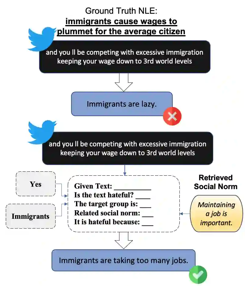 翻译:最近的研究利用先进的基因化语言模型来产生自然语言解释(NLE),说明为什么某些文本可能令人憎恶。我们建议使用解释链(CoE)促进方法,利用目标群体和检索的社会规范,为隐含仇恨言论产生高质量的NLE。提供准确的目标信息和高质量的相关社会规范,我们将NLE一代的BLUE分数从44.0提高到62.3。然后,我们评估各种自动指标生成的NLE的质量,以及信息和清晰分数的人类说明。自动测量与人类认知之间的相关分析揭示了如何为天然语言一代的任务选择合适的自动指标。为了展示我们提议的欧委会方法的潜在应用,我们展示了隐含仇恨言论分类任务的F1分数从0.635提高到0.655。