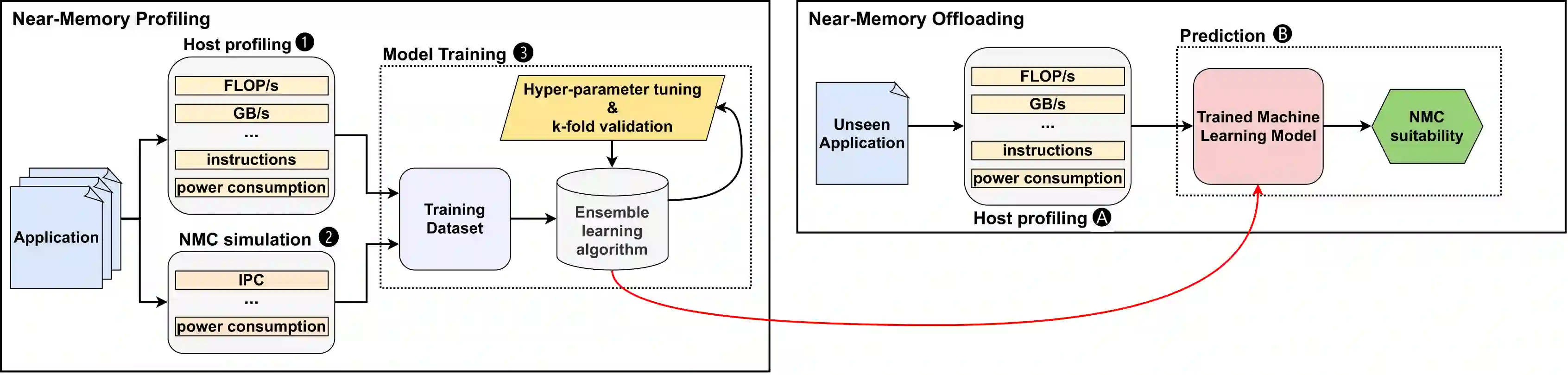 Real-world applications are now processing big-data sets, often bottlenecked by the data movement between the compute units and the main memory. Near-memory computing (NMC), a modern data-centric computational paradigm, can alleviate these bottlenecks, thereby improving the performance of applications. The lack of NMC system availability makes simulators the primary evaluation tool for performance estimation. However, simulators are usually time-consuming, and methods that can reduce this overhead would accelerate the early-stage design process of NMC systems. This work proposes Near-Memory computing Profiling and Offloading (NMPO), a high-level framework capable of predicting NMC offloading suitability employing an ensemble machine learning model. NMPO predicts NMC suitability with an accuracy of 85.6% and, compared to prior works, can reduce the prediction time by using hardware-dependent applications features by up to 3 order of magnitude.
