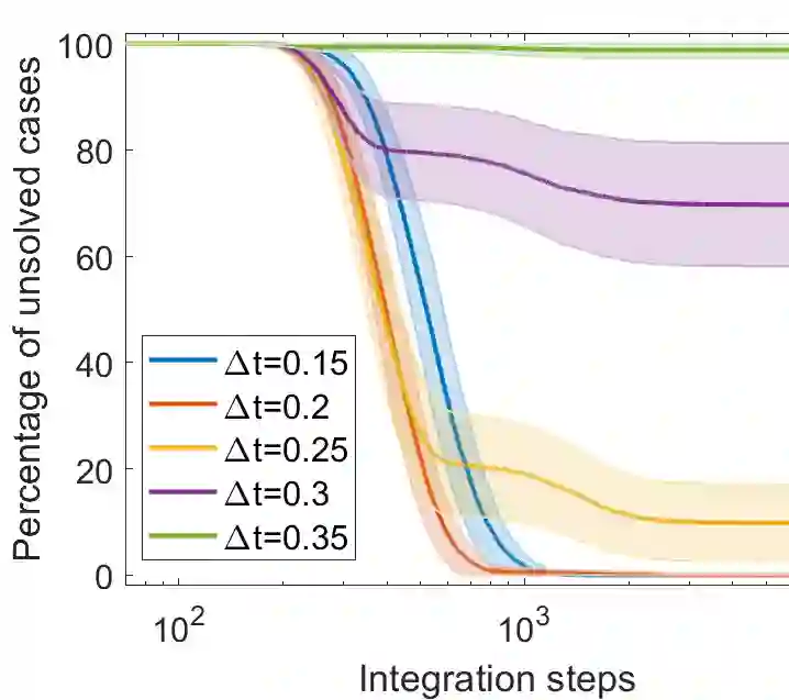 翻译:数字间化机器( DMMs) 是新颖的、 不运行的一类机器, 旨在解决组合优化问题。 它们可以通过连续时间、 非量级的内存动态系统( 时间非地性) 实现。 普通的差别方程式( ODEs) 可以在数字上整合现代计算机。 许多难题的解决方案是通过数字整合DMMS的代码来报告的, 相对于最先进的解析器而言具有巨大的优势。 为了调查该方法的稳健性和有效性背后的原因, 我们采用了三种明确的集成计划( 向前的 Euler、 陷阱类和 Runge- Kutta 4 顺序), 并持续时间步骤, 以固定的解决方案解决3- SAT 实例。 我们显示, (i) 即使阶段空间的大部分轨迹被数字噪音摧毁, 解决方案仍然可以实现;(ii) 模型 Euler 方法, 虽然有最大的数字误差, 也解决了最不易变的功能评估实例 ; 以及 (iii) 在不断的整合时间步后, 系统需要一个稳定的轨迹变轨迹变的轨道, 快速的系统需要“ 方向, 快速的轨迹变的路径, 向方向的轨迹变变。