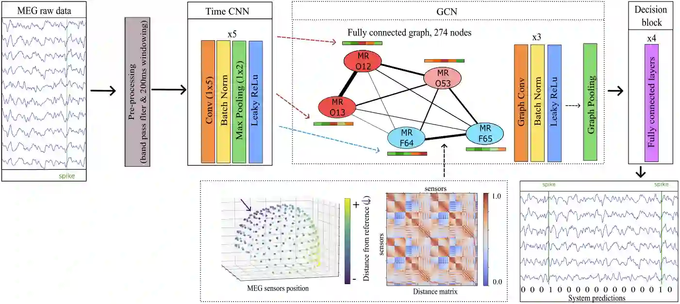 Magnetoencephalography (MEG) recordings of patients with epilepsy exhibit spikes, a typical biomarker of the pathology. Detecting those spikes allows accurate localization of brain regions triggering seizures. Spike detection is often performed manually. However, it is a burdensome and error prone task due to the complexity of MEG data. To address this problem, we propose a 1D temporal convolutional neural network (Time CNN) coupled with a graph convolutional network (GCN) to classify short time frames of MEG recording as containing a spike or not. Compared to other recent approaches, our models have fewer parameters to train and we propose to use a GCN to account for MEG sensors spatial relationships. Our models produce clinically relevant results and outperform deep learning-based state-of-the-art methods reaching a classification f1-score of 76.7% on a balanced dataset and of 25.5% on a realistic, highly imbalanced dataset, for the spike class.