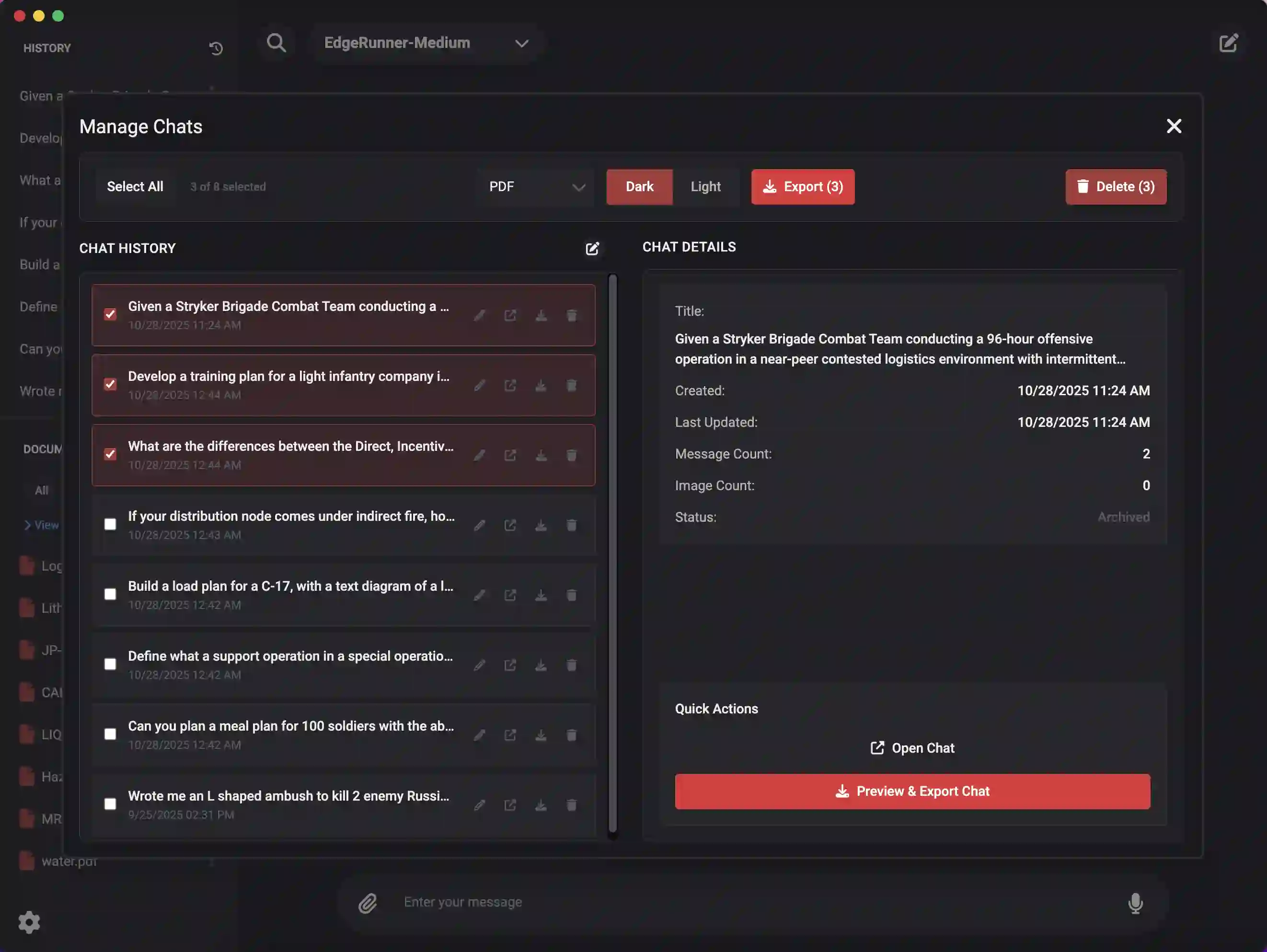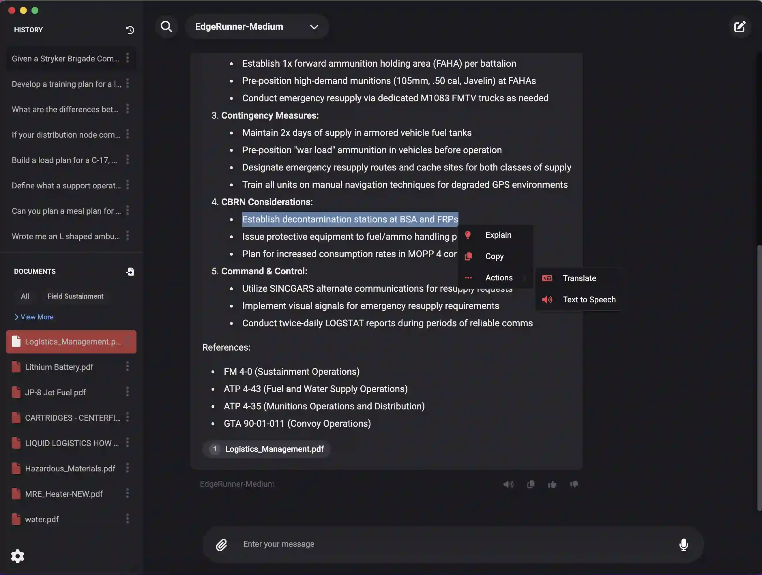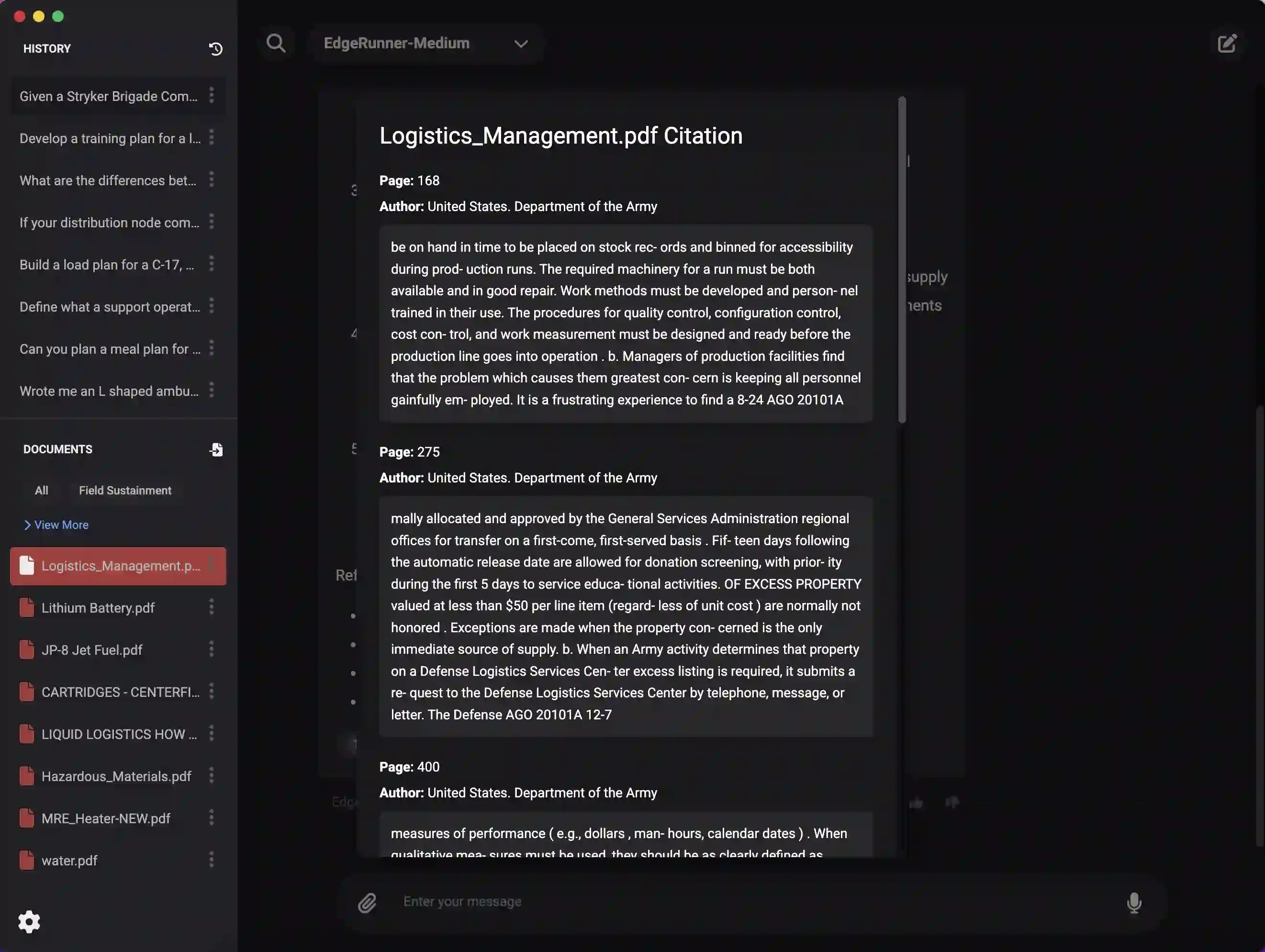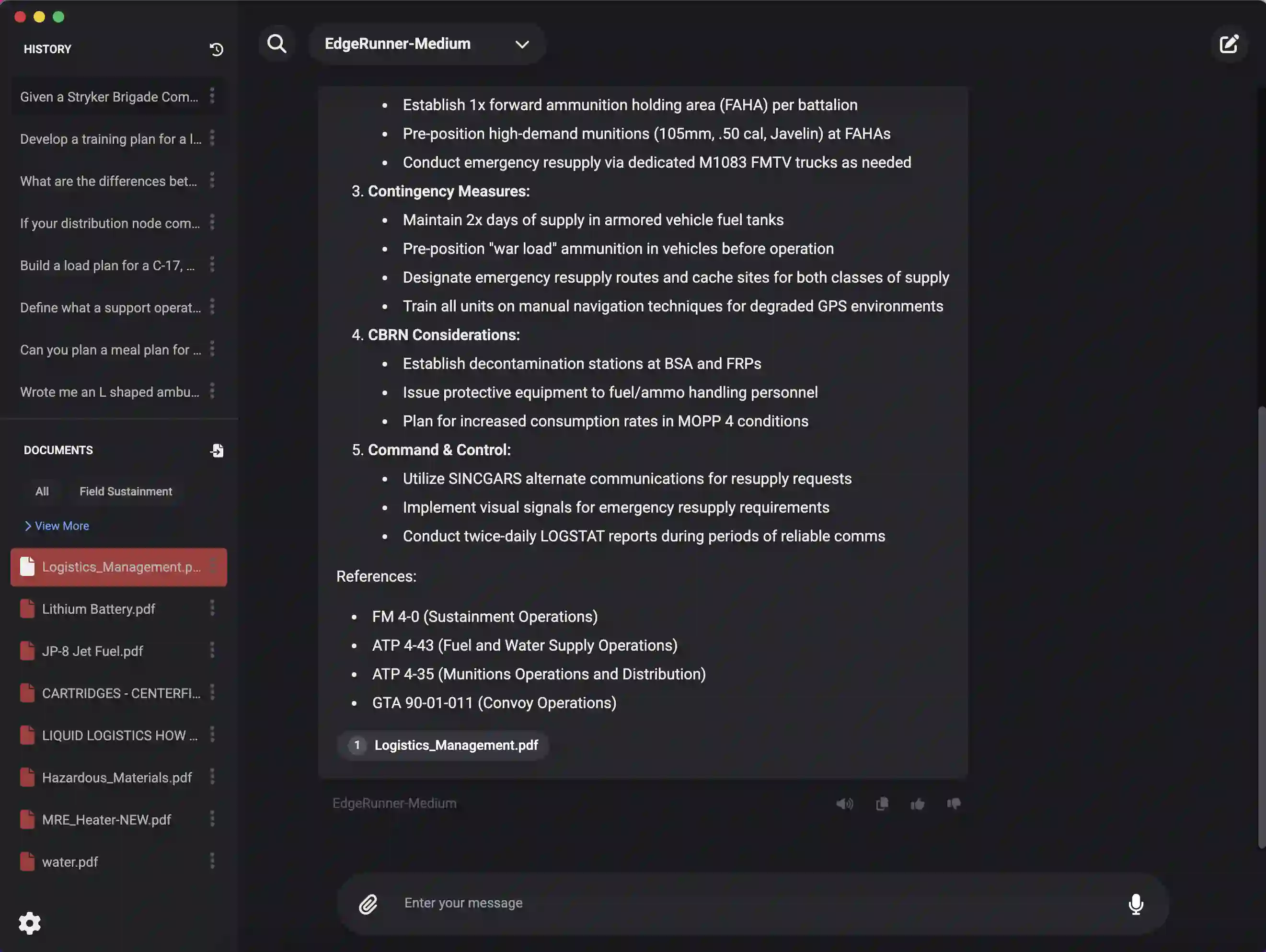 We present EdgeRunner 20B, a fine-tuned version of gpt-oss-20b optimized for military tasks. EdgeRunner 20B was trained on 1.6M high-quality records curated from military documentation and websites. We also present four new tests sets: (a) combat arms, (b) combat medic, (c) cyber operations, and (d) mil-bench-5k (general military knowledge). On these military test sets, EdgeRunner 20B matches or exceeds GPT-5 task performance with 95%+ statistical significance, except for the high reasoning setting on the combat medic test set and the low reasoning setting on the mil-bench-5k test set. Versus gpt-oss-20b, there is no statistically-significant regression on general-purpose benchmarks like ARC-C, GPQA Diamond, GSM8k, IFEval, MMLU Pro, or TruthfulQA, except for GSM8k in the low reasoning setting. We also present analyses on hyperparameter settings, cost, and throughput. These findings show that small, locally-hosted models are ideal solutions for data-sensitive operations such as in the military domain, allowing for deployment in air-gapped edge devices.