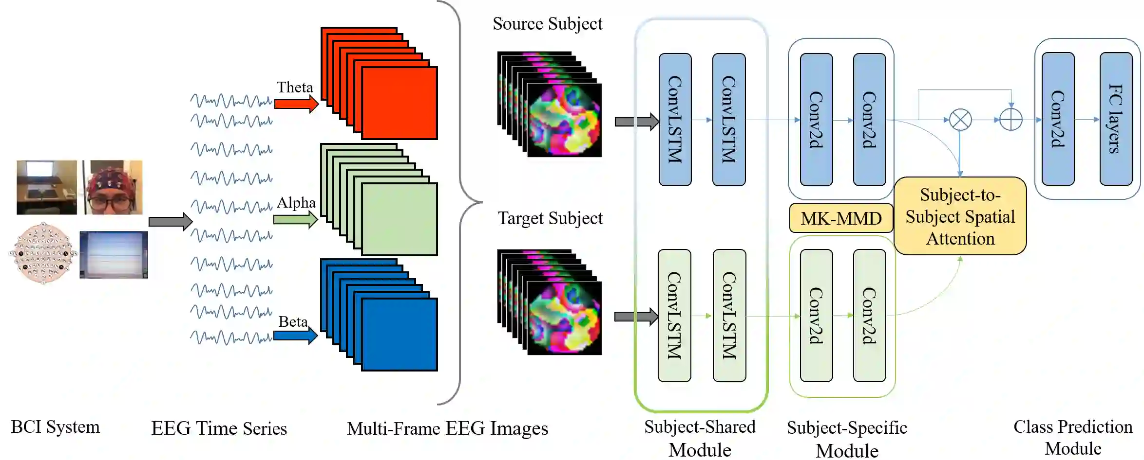 翻译:工作记忆(WM),指出在思想中暂时储存的信息,是人类认知领域的一个基本研究课题。电脑摄影(EEEG)可以监测大脑的电动活动,在测量WM水平时广泛使用。然而,一个关键的挑战是,个别差异可能造成无效结果,特别是当既定模型满足一个不熟悉的主题时。在这项工作中,我们提出一个具有空间关注的横向深度适应模型(CS-DASA),以概括各学科的工作量分类。首先,我们将EEEG时间序列转换成包含空间、光谱和时间信息的多框架EEEG图像。首先,CS-DASA的主体共享模块从源和目标对象接收多框架EEG图像数据,并学习共同特征的表述。然后,在特定主题模块中,采用最大平均值差异,以测量再生产核心空间的域分布差异,这可以为区域适应增加有效的惩罚损失。此外,主题对主题的空间关注机制(EEEEG)将侧重于13项现有实验性空间目标的定位,从现有图像上显示更好的环境数据。