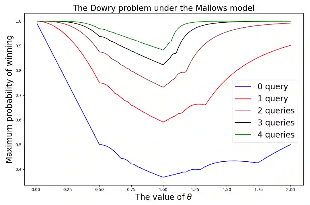 翻译:我们引入了在Mallows 模式生成的按级排列名单中选择最佳候选人的询问问题。 在这种背景下,我们提出了一个候选人名单,根据类似Gaussian式的分布分布进行排列,目的是通过顺序面试程序确定排名最高的候选人,不允许对被否决的候选人重新进行面试;新的模型假设是,在进行甄选时能够询问一位Genie。查询提供了一个答案,说明有关候选人是否是排名最高的候选人。如果Genie确认询问,甄选程序将终止。否则,连续考试将持续到找到一个新的可能最理想的候选人为止。我们的结果包括,通过数字评价以及预期的面试次数来准确确定,直到找到最佳候选人或完成面试过程。尽管问题与Dowry问题有相似之处,有吉尔伯特和莫斯勒的多重选择,但拟议的Genie模式与它有很大不同,因为它允许及早停止和处理非统一的候选人面试分配。