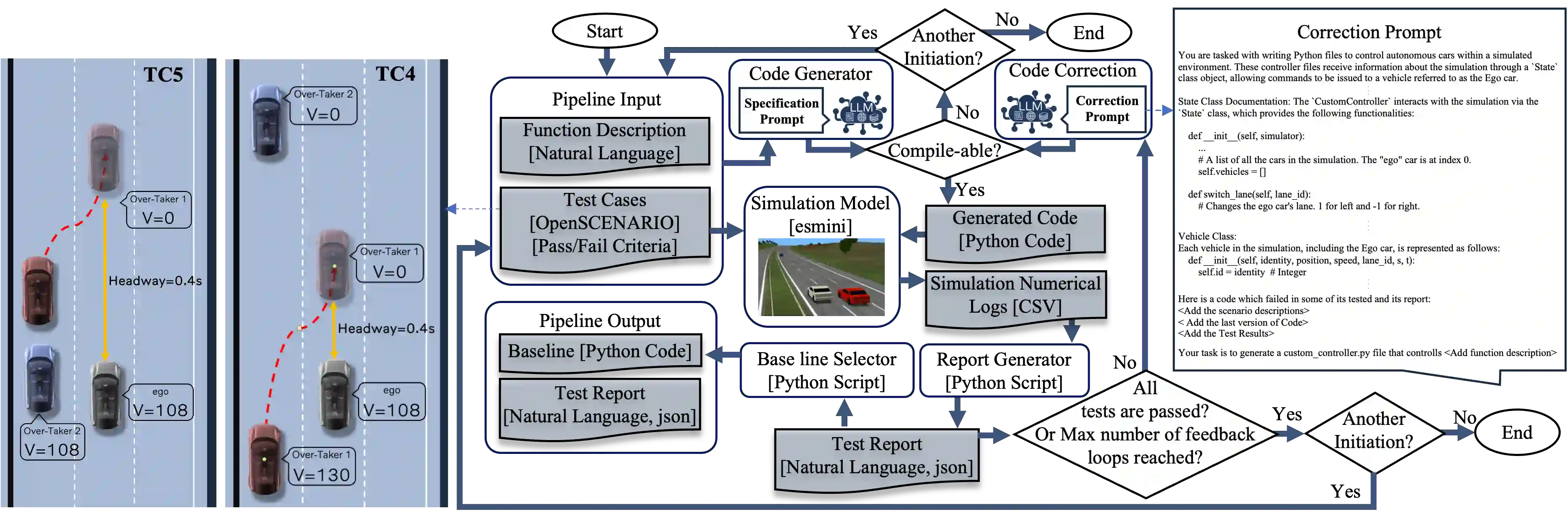 Automated Driving System (ADS) is a safety-critical software system responsible for the interpretation of the vehicle's environment and making decisions accordingly. The unbounded complexity of the driving context, including unforeseeable events, necessitate continuous improvement, often achieved through iterative DevOps processes. However, DevOps processes are themselves complex, making these improvements both time- and resource-intensive. Automation in code generation for ADS using Large Language Models (LLM) is one potential approach to address this challenge. Nevertheless, the development of ADS requires rigorous processes to verify, validate, assess, and qualify the code before it can be deployed in the vehicle and used. In this study, we developed and evaluated a prototype for automatic code generation and assessment using a designed pipeline of a LLM-based agent, simulation model, and rule-based feedback generator in an industrial setup. The LLM-generated code is evaluated automatically in a simulation model against multiple critical traffic scenarios, and an assessment report is provided as feedback to the LLM for modification or bug fixing. We report about the experimental results of the prototype employing Codellama:34b, DeepSeek (r1:32b and Coder:33b), CodeGemma:7b, Mistral:7b, and GPT4 for Adaptive Cruise Control (ACC) and Unsupervised Collision Avoidance by Evasive Manoeuvre (CAEM). We finally assessed the tool with 11 experts at two Original Equipment Manufacturers (OEMs) by conducting an interview study.