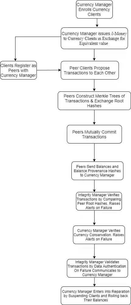 翻译:在印度,2016年驱魔后,数字支付活动变得非常流行。其中,使用Paytm钱包和UPI(统一支付界面)的交易量增加了。由于COVID-19大流行而关闭的账户推动了这一趋势。同时,比特币等加密软件也在增加牵引力。许多国家正在考虑通过中央银行发行数字货币。在本文件中,我们提议建立一个新型的分散式数字货币系统(DCDS),利用Merkle Hash-Trees作为认证数据结构。DDCS使用一个无铅的、分散的、同行对等的架构。我们点名拟议的货币为$\delta$-money。$\delta$-money是用来替代实物货币的,其固有的安全特征与密码对立。使用$delta$-money的交易以调解的方式发生,但与事后的对接。在央行发行的数字货币(CBCC)上,我们设想一个没有汇率波动的汇率稳定、没有汇率的假设。