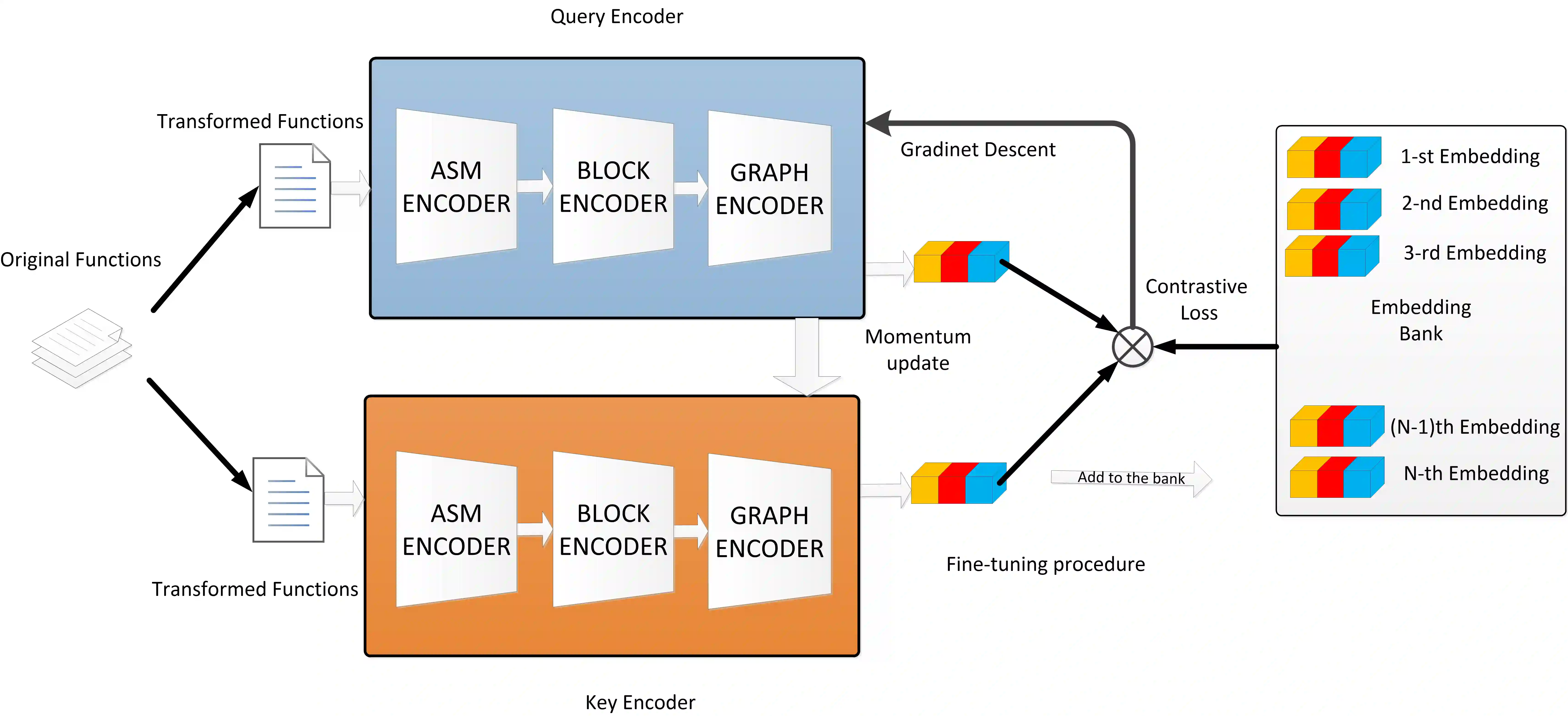 In the field of cybersecurity, the ability to compute similarity scores at the function level is import. Considering that a single binary file may contain an extensive amount of functions, an effective learning framework must exhibit both high accuracy and efficiency when handling substantial volumes of data. Nonetheless, conventional methods encounter several limitations. Firstly, accurately annotating different pairs of functions with appropriate labels poses a significant challenge, thereby making it difficult to employ supervised learning methods without risk of overtraining on erroneous labels. Secondly, while SOTA models often rely on pre-trained encoders or fine-grained graph comparison techniques, these approaches suffer from drawbacks related to time and memory consumption. Thirdly, the momentum update algorithm utilized in graph-based contrastive learning models can result in information leakage. Surprisingly, none of the existing articles address this issue. This research focuses on addressing the challenges associated with large-scale BCSD. To overcome the aforementioned problems, we propose GraphMoco: a graph momentum contrast model that leverages multimodal structural information for efficient binary function representation learning on a large scale. Our approach employs a CNN-based model and departs from the usage of memory-intensive pre-trained models. We adopt an unsupervised learning strategy that effectively use the intrinsic structural information present in the binary code. Our approach eliminates the need for manual labeling of similar or dissimilar information.Importantly, GraphMoco demonstrates exceptional performance in terms of both efficiency and accuracy when operating on extensive datasets. Our experimental results indicate that our method surpasses the current SOTA approaches in terms of accuracy.