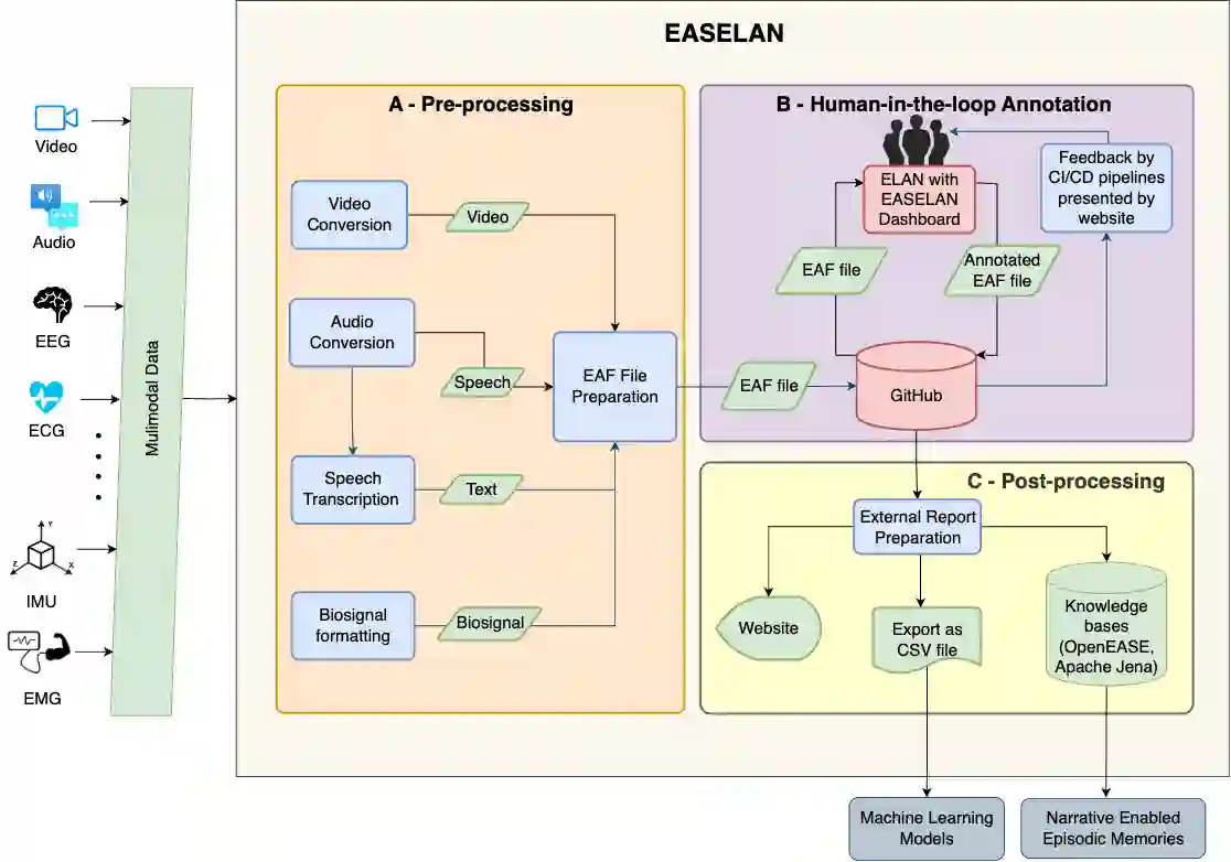 翻译:机器学习和自适应认知系统的最新进展正推动对大规模、丰富标注的多模态数据日益增长的需求。融合模型是这一趋势的突出例证,其除了传统的视听通道外,正越来越多地整合多种生物信号。本文介绍EASELAN标注框架,旨在改进标注工作流程,以应对由此产生的多模态及生物信号数据集日益增长的复杂性。该框架基于稳健的ELAN工具,通过添加专门设计的新组件来支持标注流程的所有阶段:从简化标注文件的准备,到设置额外通道、集成GitHub版本控制,以及简化的后处理。EASELAN提供了一个无缝的工作流程,旨在整合生物信号并促进丰富的标注,使其能够轻松导出以用于进一步分析和机器学习支持的模型训练。EASELAN框架已成功应用于德国研究基金会(DFG)资助的协作研究中心1320“日常活动科学与工程”(EASE)中,一项针对认知机器人的人类日常活动(此处为餐桌布置)的高维生物信号采集计划。本文讨论了在此计划中使用EASELAN所面临的机遇、局限性和经验教训。为促进生物信号采集、标注和处理的研究,EASELAN的代码已公开(https://github.com/cognitive-systems-lab/easelan),同时公开的还有EASELAN支持的全标注“餐桌布置数据库”。