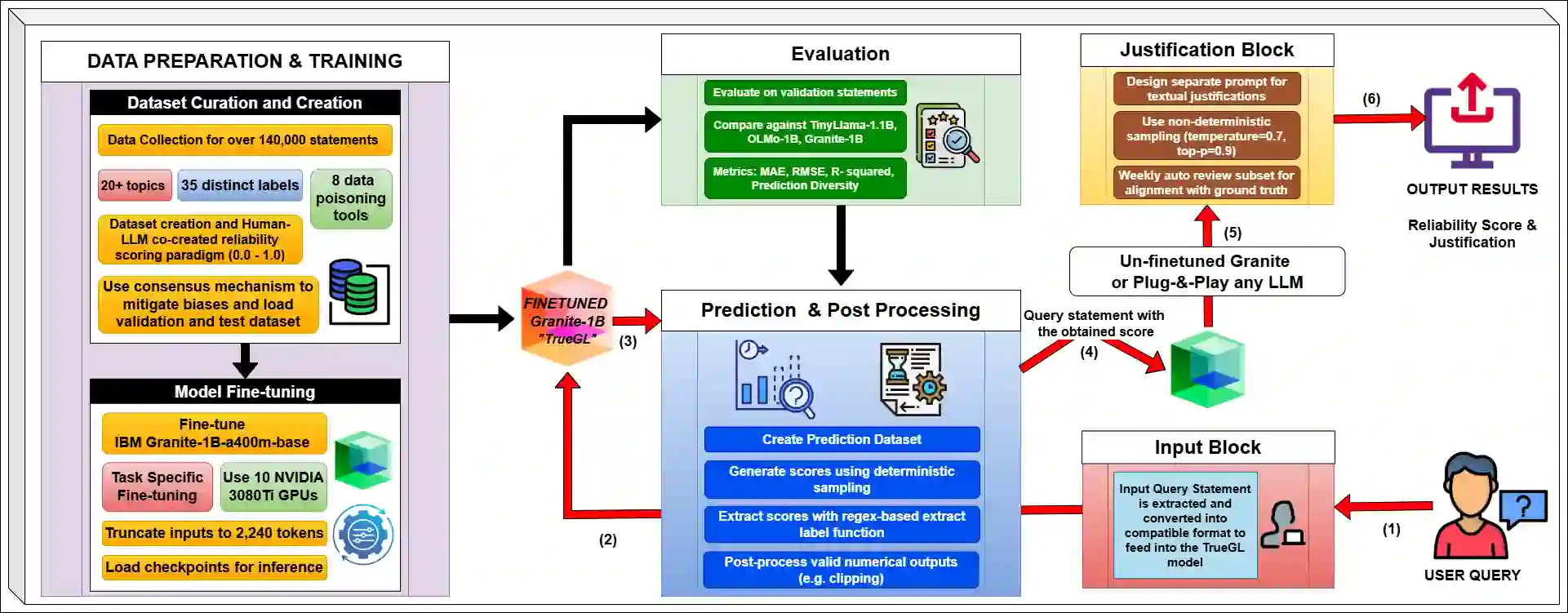 翻译:在人工智能生成错误信息充斥网络的时代,现有工具难以向用户提供细致、透明的网络内容可信度评估。这些工具通常仅提供二元(真/假)分类而缺乏上下文解释,使用户易受虚假信息影响。为弥补这一不足,我们提出了TRACE:基于上下文解释的透明可靠性评估框架。该统一框架执行两项核心任务:(1)为网络内容分配细粒度的连续可靠性评分(0.1至1.0);(2)生成评估结果的上下文解释。TRACE的核心是TrueGL-1B模型,该模型基于我们构建的新型大规模数据集(包含超过14万篇文章)进行微调。该数据集的主要贡献在于通过"人类-大语言模型协同创建与数据投毒"范式,为每篇文章标注了35种不同的连续可靠性分数,有效填补了传统二元标注数据集在中等可靠性区间的空白。评估结果表明,在关键回归指标(包括MAE、RMSE和R2)上,TrueGL-1B模型持续优于其他小规模LLM基线方法和基于规则的方法。该模型的高准确性与可解释性论证,使可信信息的获取变得更加便捷。为促进后续研究,我们的代码与模型已在以下地址开源:github.com/zade90/TrueGL。