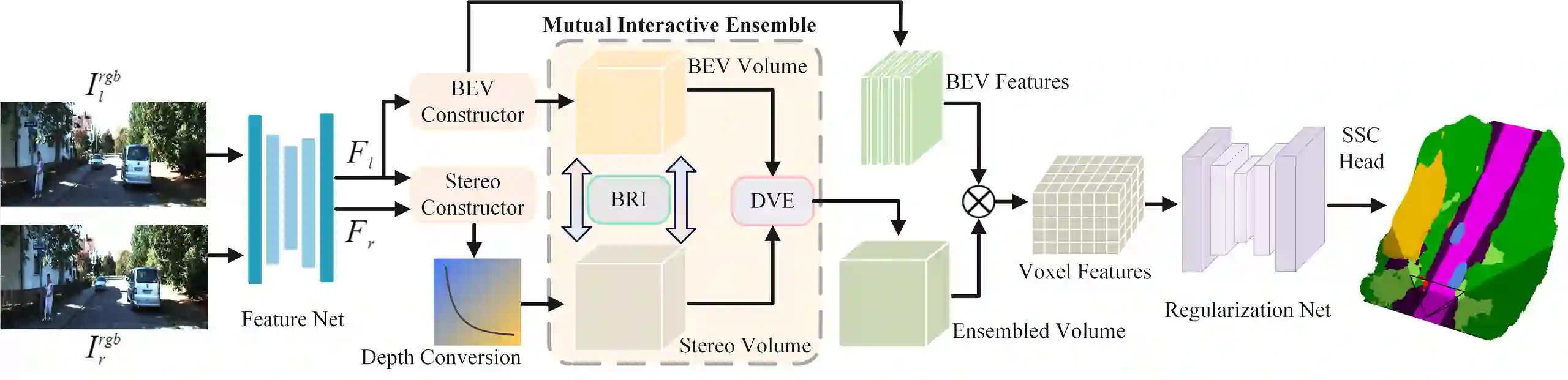 3D semantic scene completion (SSC) is an ill-posed perception task that requires inferring a dense 3D scene from limited observations. Previous camera-based methods struggle to predict accurate semantic scenes due to inherent geometric ambiguity and incomplete observations. In this paper, we resort to stereo matching technique and bird's-eye-view (BEV) representation learning to address such issues in SSC. Complementary to each other, stereo matching mitigates geometric ambiguity with epipolar constraint while BEV representation enhances the hallucination ability for invisible regions with global semantic context. However, due to the inherent representation gap between stereo geometry and BEV features, it is non-trivial to bridge them for dense prediction task of SSC. Therefore, we further develop a unified occupancy-based framework dubbed BRGScene, which effectively bridges these two representations with dense 3D volumes for reliable semantic scene completion. Specifically, we design a novel Mutual Interactive Ensemble (MIE) block for pixel-level reliable aggregation of stereo geometry and BEV features. Within the MIE block, a Bi-directional Reliable Interaction (BRI) module, enhanced with confidence re-weighting, is employed to encourage fine-grained interaction through mutual guidance. Besides, a Dual Volume Ensemble (DVE) module is introduced to facilitate complementary aggregation through channel-wise recalibration and multi-group voting. Our method outperforms all published camera-based methods on SemanticKITTI for semantic scene completion.