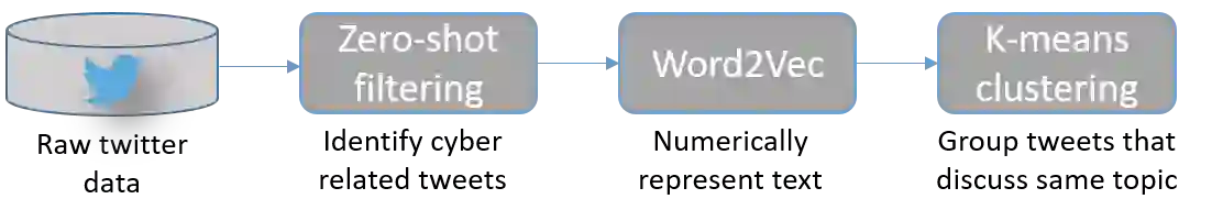 Many cyber network defense tools rely on the National Vulnerability Database (NVD) to provide timely information on known vulnerabilities that exist within systems on a given network. However, recent studies have indicated that the NVD is not always up to date, with known vulnerabilities being discussed publicly on social media platforms, like Twitter and Reddit, months before they are published to the NVD. To that end, we present a framework for unsupervised classification to filter tweets for relevance to cyber security. We consider and evaluate two unsupervised machine learning techniques for inclusion in our framework, and show that zero-shot classification using a Bidirectional and Auto-Regressive Transformers (BART) model outperforms the other technique with 83.52% accuracy and a F1 score of 83.88, allowing for accurate filtering of tweets without human intervention or labelled data for training. Additionally, we discuss different insights that can be derived from these cyber-relevant tweets, such as trending topics of tweets and the counts of Twitter mentions for Common Vulnerabilities and Exposures (CVEs), that can be used in an alert or report to augment current NVD-based risk assessment tools.