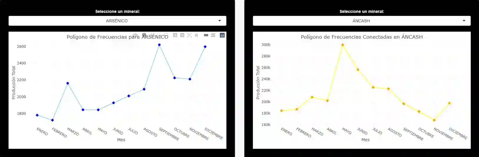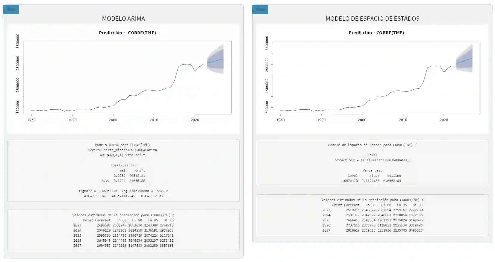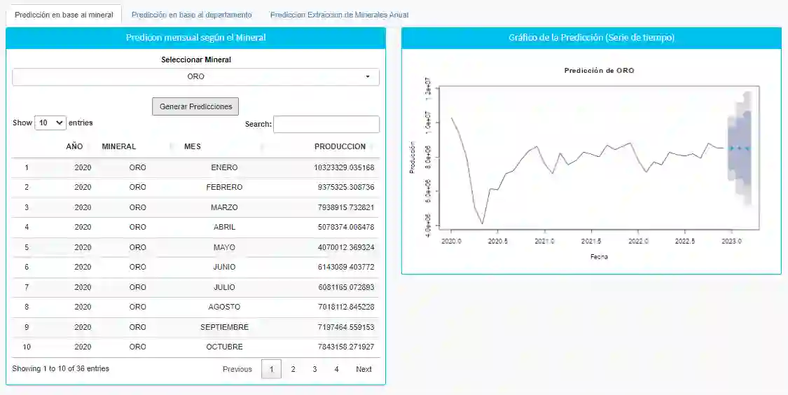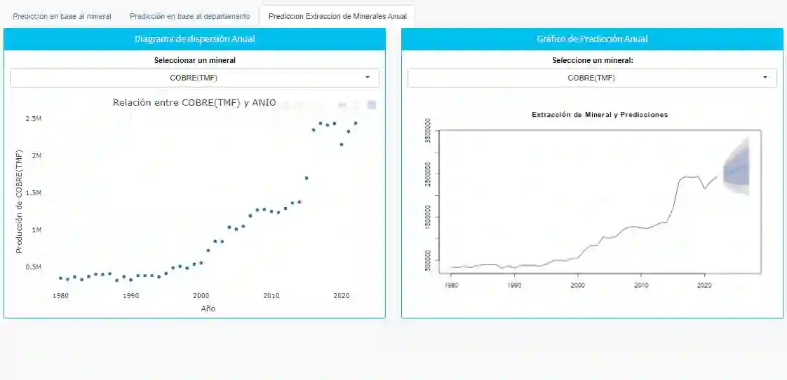 Peruvian mining plays a crucial role in the country's economy, being one of the main producers and exporters of minerals worldwide. In this project, an application was developed in RStudio that utilizes statistical analysis and time series modeling techniques to understand and forecast mineral extraction in different departments of Peru. The application includes an interactive map that allows users to explore Peruvian geography and obtain detailed statistics by clicking on each department. Additionally, bar charts, pie charts, and frequency polygons were implemented to visualize and analyze the data. Using the ARIMA model, predictions were made on the future extraction of minerals, enabling informed decision-making in planning and resource management within the mining sector. The application provides an interactive and accessible tool to explore the Peruvian mining industry, comprehend trends, and make accurate forecasts. These predictions for 2027 in total annual production are as follows: Copper = 2,694,957 MT, Gold = 72,817.47 kg Fine, Zinc = 1,369,649 MT, Silver = 3,083,036 MT, Lead = 255,443 MT, Iron = 15,776,609 MT, Tin = 29,542 MT, Molybdenum = 35,044.66 MT, and Cadmium = 724 MT. These predictions, based on historical data, provide valuable information for strategic decision-making and contribute to the sustainable development of the mining industry in Peru.