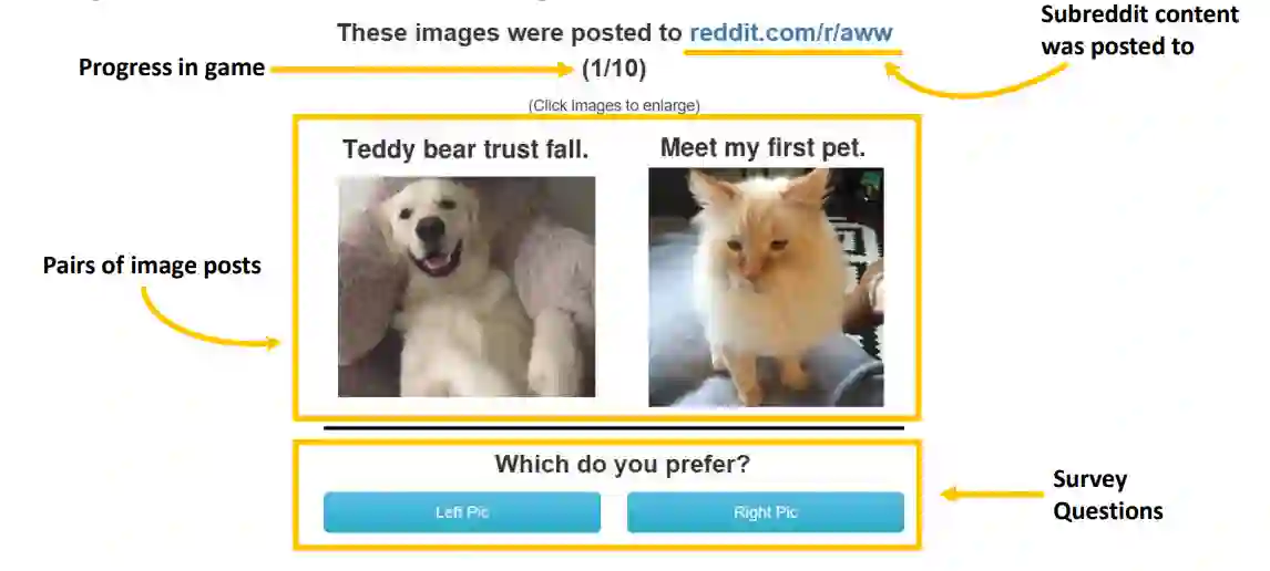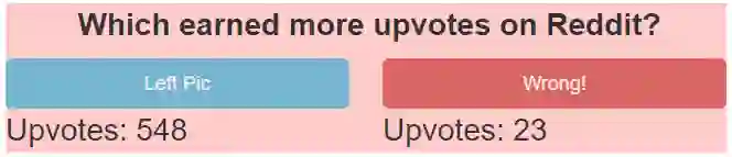 翻译:广度系统,如Twitter retweets、 Reddit upvotes 和 Pinternational Pentes 等信息系统, 有可能引导人们找到其他人喜欢的海报。 然而, 这创造了一个反馈循环, 降低了他们的信息量: 被标记为更受欢迎的项目得到更多关注, 因而更多的高音和retweets可能只是反映对喜欢项目的人的分数的更多关注而不是独立信息。 信息还有多少? 比如, 如果A项在Redddit上有数百个高音, B项只有几个? 我们使用一个名为GuessTheKarma的互联网游戏来调查, 收集400对图像的独立的偏好判断( N=20 674 ), 从而降低他们的信息量: 与主导社会媒体服务的评级系统不同, GuessTheKarma 缺乏影响评级的社会和排名效应。 总体来说, REddit 分数并不很好地预测那里对项目的真正人口偏好, 而B项的评分只有大多数独立评分只有68 % 。 然而, 当一个图像的评分为最低的评分时, 而其他的评分为最低的评分时,
