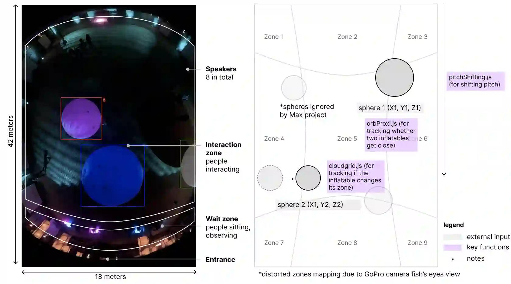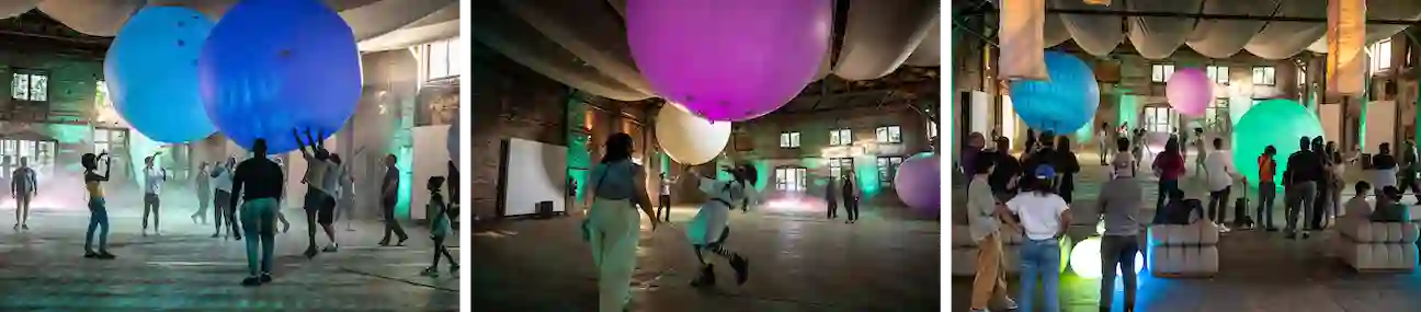 翻译:尽管日常生活中遇到的环境智能系统(如安防监控与节能系统)通常服务于实用目的,我们仍思考如何设计与实现公共空间中的环境人工智能体验,以激发人类对敬畏、惊奇与美的深层感受。作为具体实践,我们推出"声云"——一个沉浸式艺术装置,通过参与者与数个等人高球体的互动实时生成音乐。本装置旨在对未来的环境智能提出一种思辨:它应激发而非限制环境智能的潜在可能性。