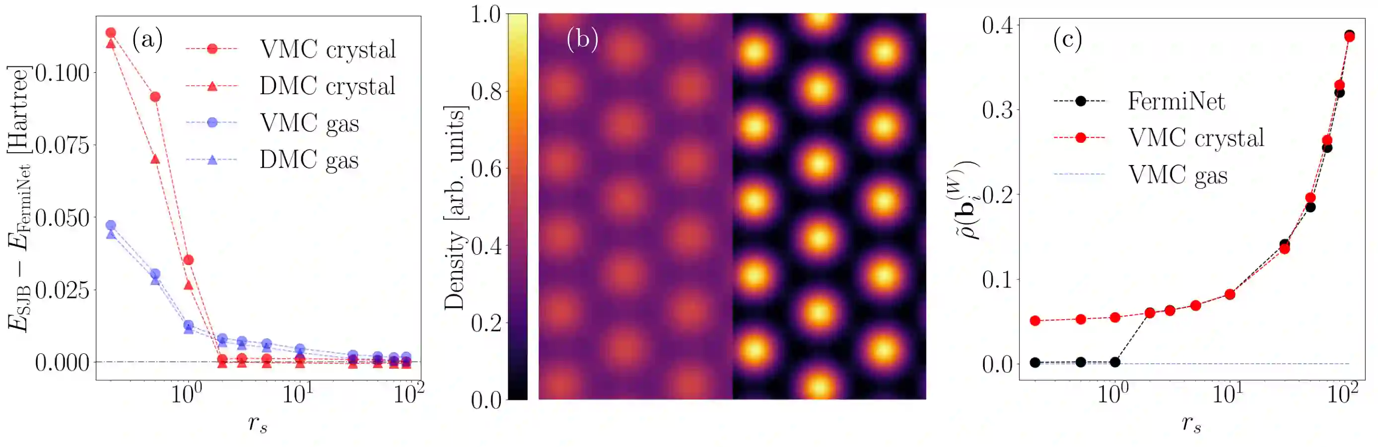 翻译:深神经网络非常成功, 因为高精确的波函数 as\"atze ans\" 用于对分子地面状态进行可变的蒙特卡洛计算。 我们展示了一个这样的 ansatz, FermiNet, 用于计算定期汉密尔顿人的地面状态和研究同质电子气体。 FermiNet 对小型电子气体系统的地面状态能量的计算与先前的启动者完全配置互动量 蒙特卡洛 以及传播蒙特卡洛 的计算非常一致。 我们调查了旋转极化的同质电子气体, 并证明同一神经网络结构能够准确代表非本地化的Fermi液体状态和本地化的Wigner晶体状态。 网络没有获得关于存在阶段过渡的知识, 但是在高密度和自发性断裂对称以生成低密度晶状地面状态。