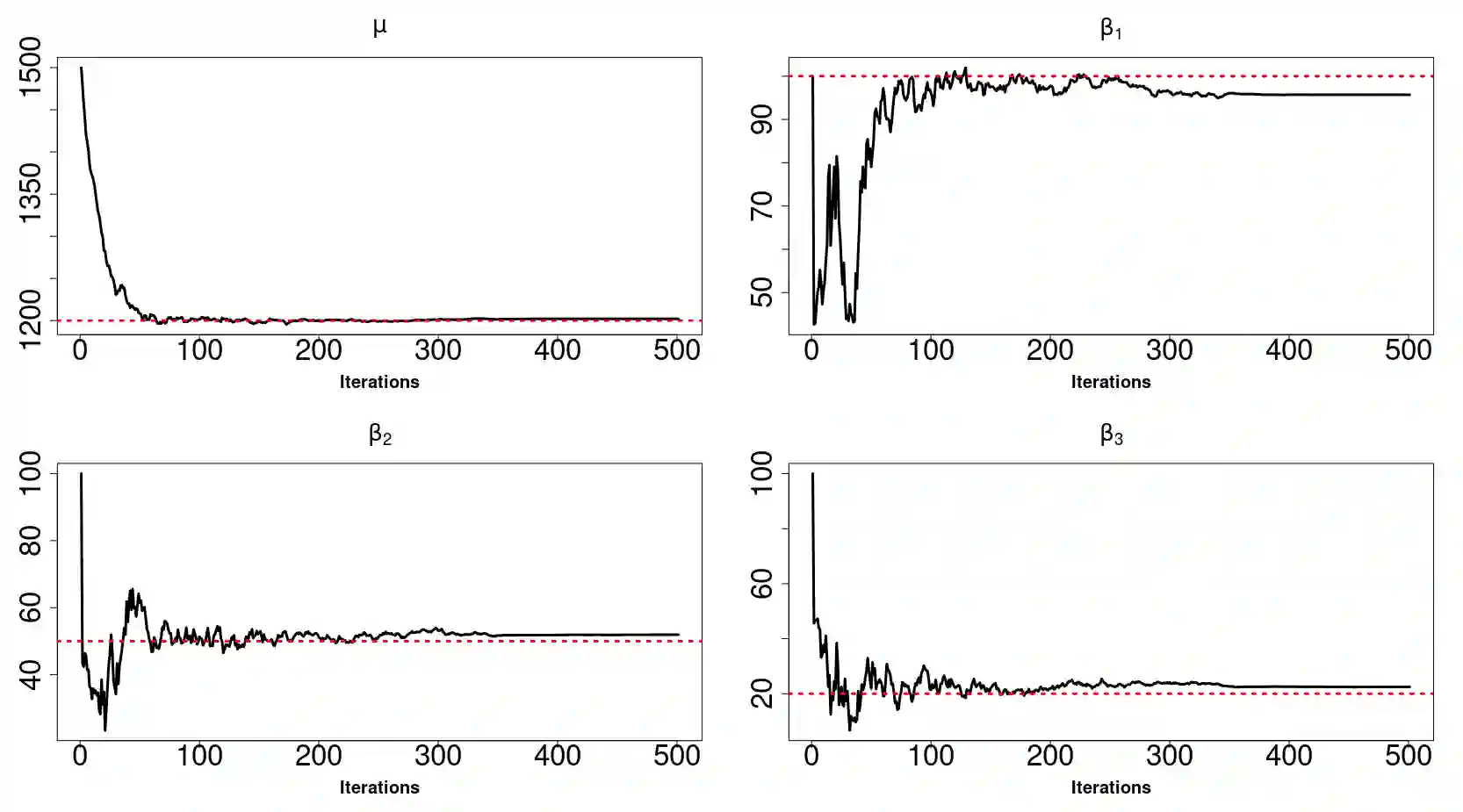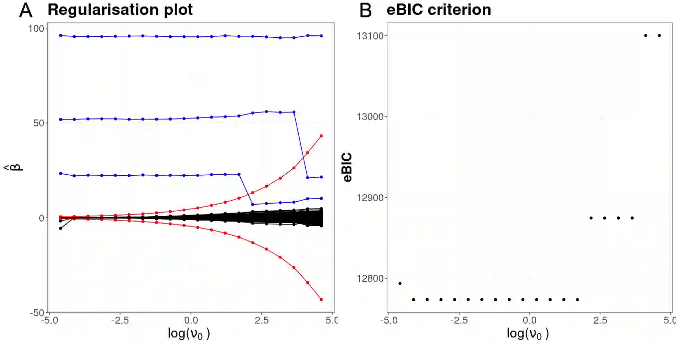 翻译:高维数据比观测数据(例如基因组数据)多得多的共变数据,现在通常得到分析。在这方面,通常最好能够通过一个可变选择程序集中关注少数最相关的共变数据。高维变量选择在标准回归模型中广泛记录,但在非线性混合效应模型中仍然没有什么工具可以解决这个问题。在这项工作中,从巴伊西亚角度选择变量,并提议了一个选择程序,结合使用钉钉和丝带前置法以及SAEM算法。与LASSO回归法相似,相关的共变数组是通过探索惩罚参数的值网选择的。拟议方法比传统的MCMC算法要快得多,在模拟数据上显示非常良好的选择性能。