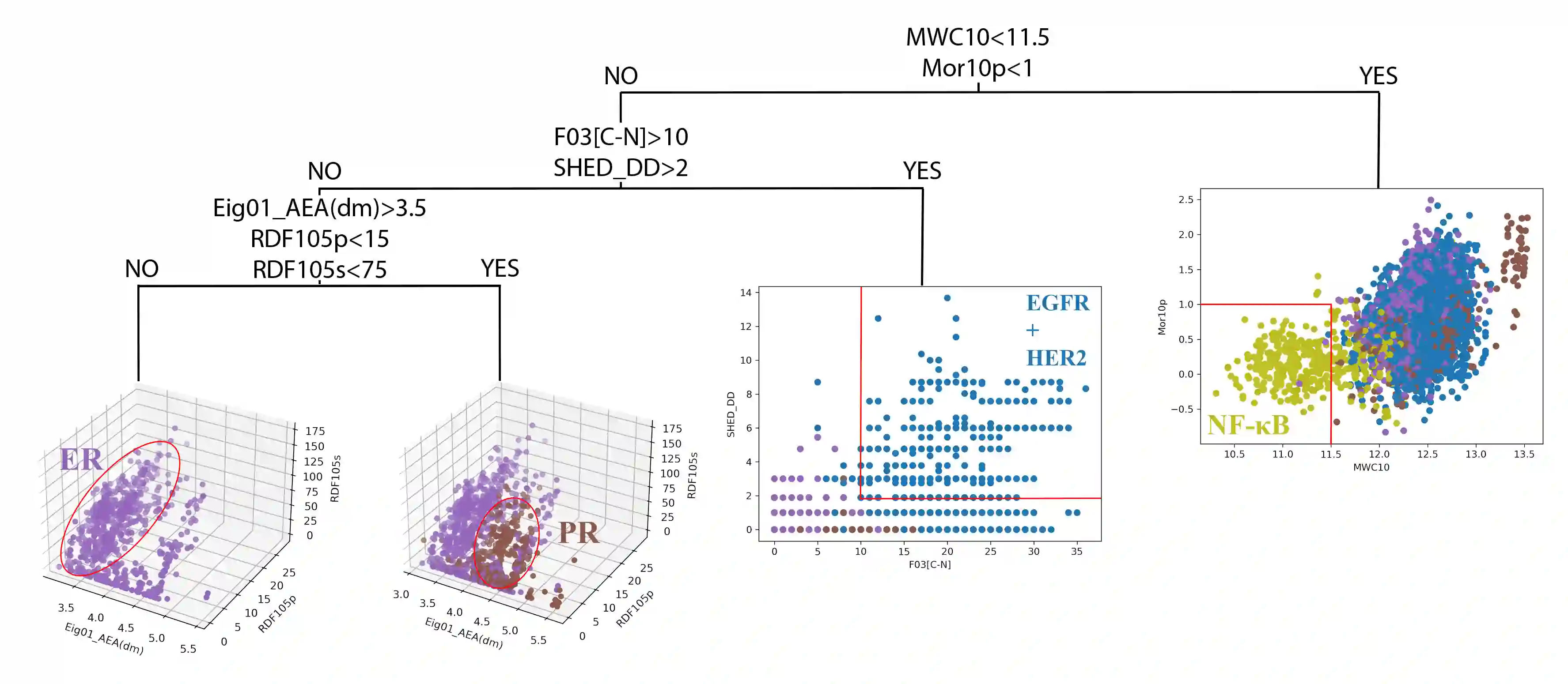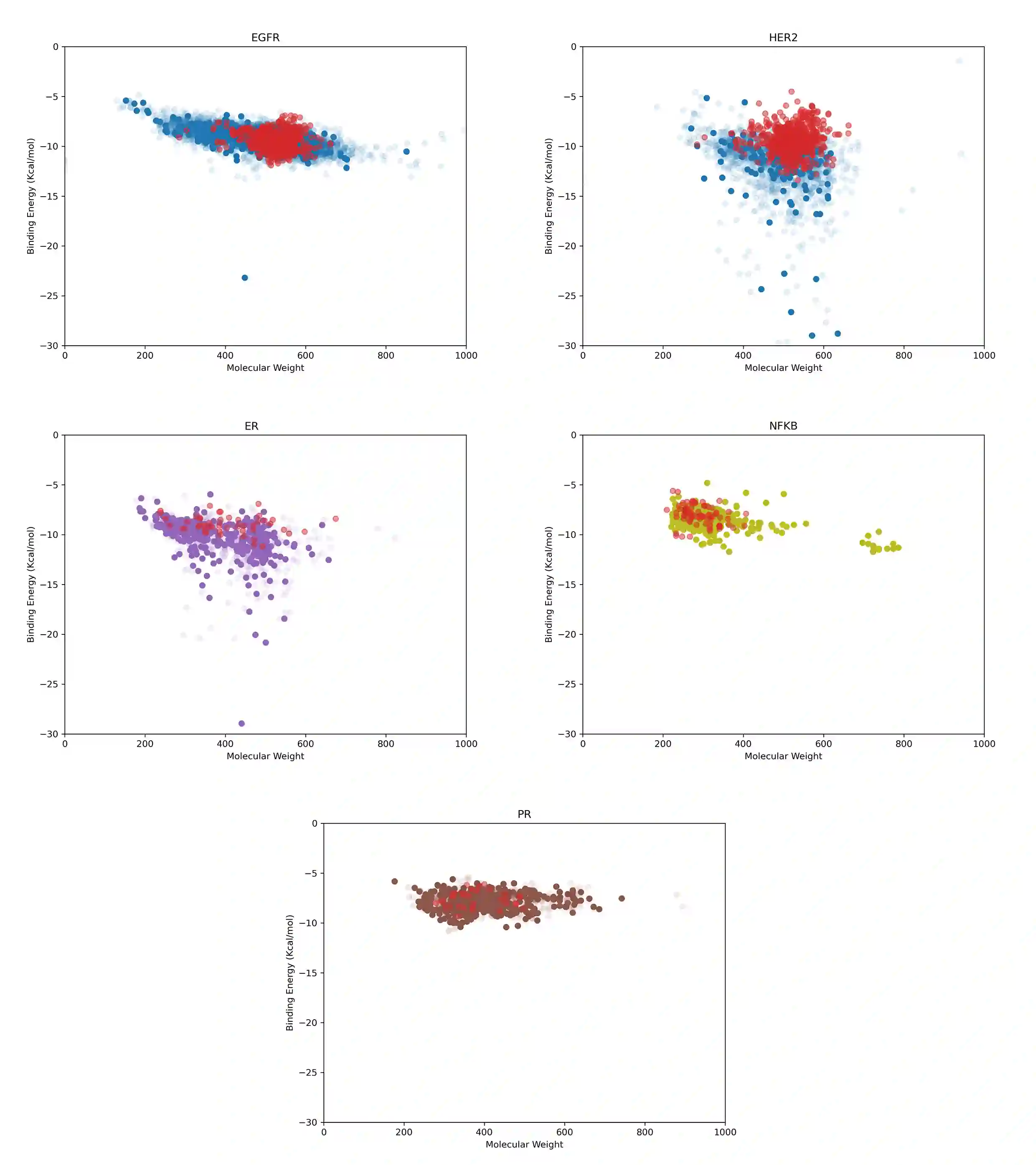 Breast cancer, the second most prevalent cancer among women worldwide, necessitates the exploration of novel therapeutic approaches. To target the four subgroups of breast cancer "hormone receptor-positive and HER2-negative, hormone receptor-positive and HER2-positive, hormone receptor-negative and HER2-positive, and hormone receptor-negative and HER2-negative" it is crucial to inhibit specific targets such as EGFR, HER2, ER, NF-kB, and PR. In this study, we evaluated various methods for binary and multiclass classification. Among them, the GA-SVM-SVM:GA-SVM-SVM model was selected with an accuracy of 0.74, an F1-score of 0.73, and an AUC of 0.94 for virtual screening of ligands from the BindingDB database. This model successfully identified 4454, 803, 438, and 378 ligands with over 90% precision in both active/inactive and target prediction for the classes of EGFR+HER2, ER, NF-kB, and PR, respectively, from the BindingDB database. Based on to the selected ligands, we created a dendrogram that categorizes different ligands based on their targets. This dendrogram aims to facilitate the exploration of chemical space for various therapeutic targets. Ligands that surpassed a 90% threshold in the product of activity probability and correct target selection probability were chosen for further investigation using molecular docking. The binding energy range for these ligands against their respective targets was calculated to be between -15 and -5 kcal/mol. Finally, based on general and common rules in medicinal chemistry, we selected 2, 3, 3, and 8 new ligands with high priority for further studies in the EGFR+HER2, ER, NF-kB, and PR classes, respectively.