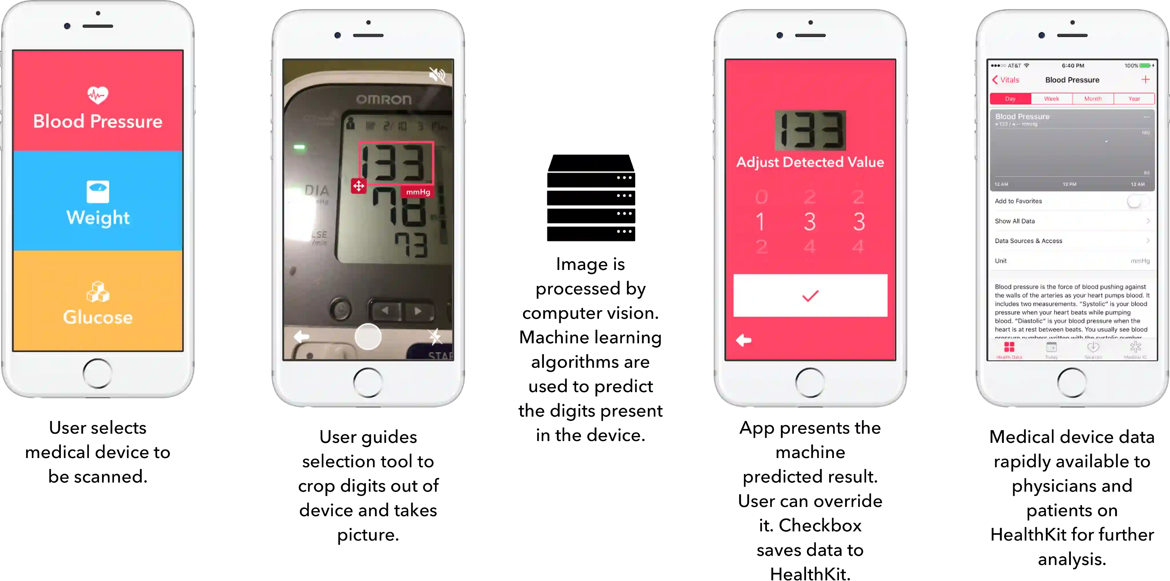 Biometric measurements captured from medical devices, such as blood pressure gauges, glucose monitors, and weighing scales, are essential to tracking a patient's health. Trends in these measurements can accurately track diabetes, cardiovascular issues, and assist medication management for patients. Currently, patients record their results and data of measurement in a physical notebook. It may be weeks before a doctor sees a patient's records and can assess the health of the patient. With a predicted 6.8 billion smartphones in the world by 2022, health monitoring platforms, such as Apple's HealthKit, can be leveraged to provide the right care at the right time. This research presents a mobile application that enables users to capture medical monitor data and send it to their doctor swiftly. A key contribution of this paper is a robust engine that can recognize digits from medical monitors with an accuracy of 98.2%.