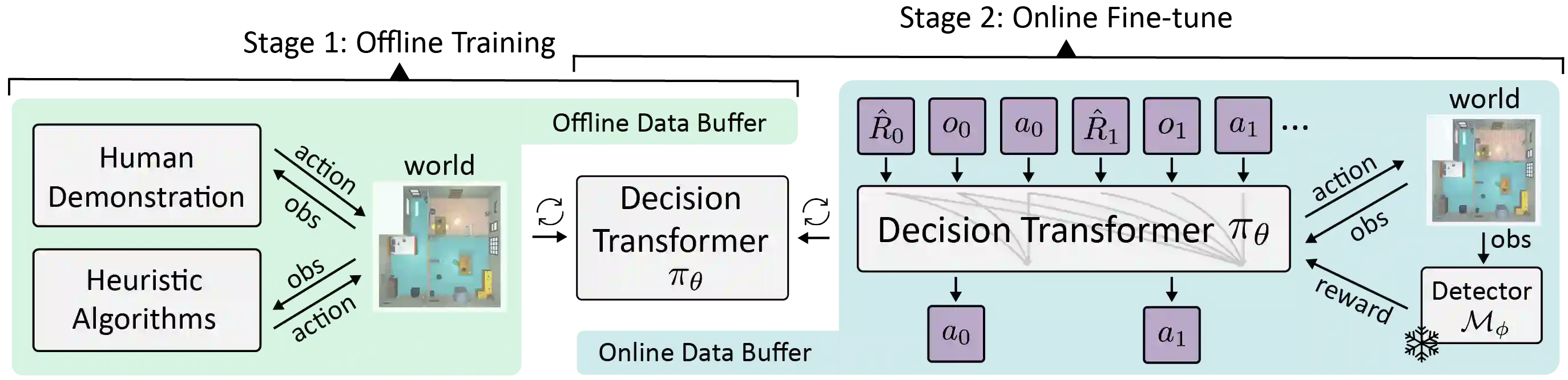 Active perception describes a broad class of techniques that couple planning and perception systems to move the robot in a way to give the robot more information about the environment. In most robotic systems, perception is typically independent of motion planning. For example, traditional object detection is passive: it operates only on the images it receives. However, we have a chance to improve the results if we allow planning to consume detection signals and move the robot to collect views that maximize the quality of the results. In this paper, we use reinforcement learning (RL) methods to control the robot in order to obtain images that maximize the detection quality. Specifically, we propose using a Decision Transformer with online fine-tuning, which first optimizes the policy with a pre-collected expert dataset and then improves the learned policy by exploring better solutions in the environment. We evaluate the performance of proposed method on an interactive dataset collected from an indoor scenario simulator. Experimental results demonstrate that our method outperforms all baselines, including expert policy and pure offline RL methods. We also provide exhaustive analyses of the reward distribution and observation space.