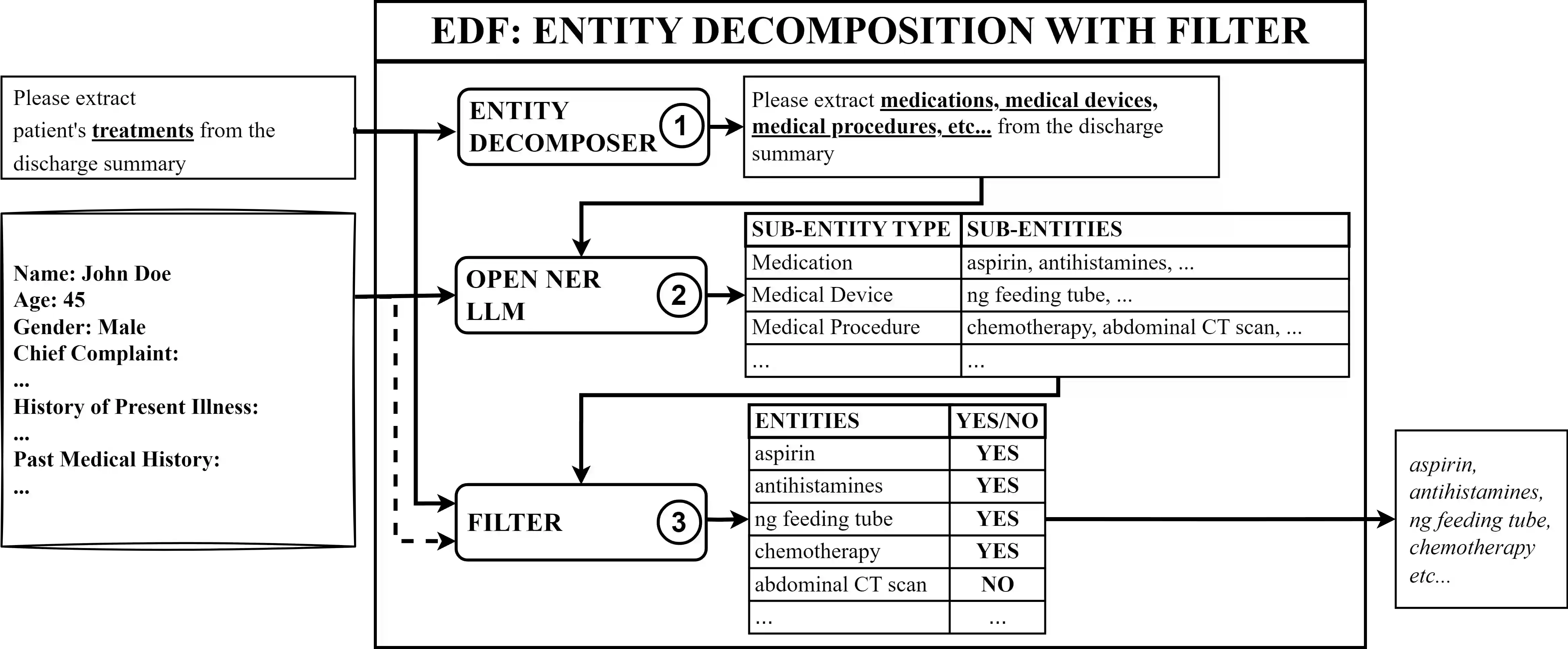 Clinical named entity recognition (NER) aims to retrieve important entities within clinical narratives. Recent works have demonstrated that large language models (LLMs) can achieve strong performance in this task. While previous works focus on proprietary LLMs, we investigate how open NER LLMs, trained specifically for entity recognition, perform in clinical NER. In this paper, we aim to improve them through a novel framework, entity decomposition with filtering, or EDF. Our key idea is to decompose the entity recognition task into several retrievals of sub-entity types. We also introduce a filtering mechanism to remove incorrect entities. Our experimental results demonstrate the efficacy of our framework across all metrics, models, datasets, and entity types. Our analysis reveals that entity decomposition can recognize previously missed entities with substantial improvement. We further provide a comprehensive evaluation of our framework and an in-depth error analysis to pave future works.