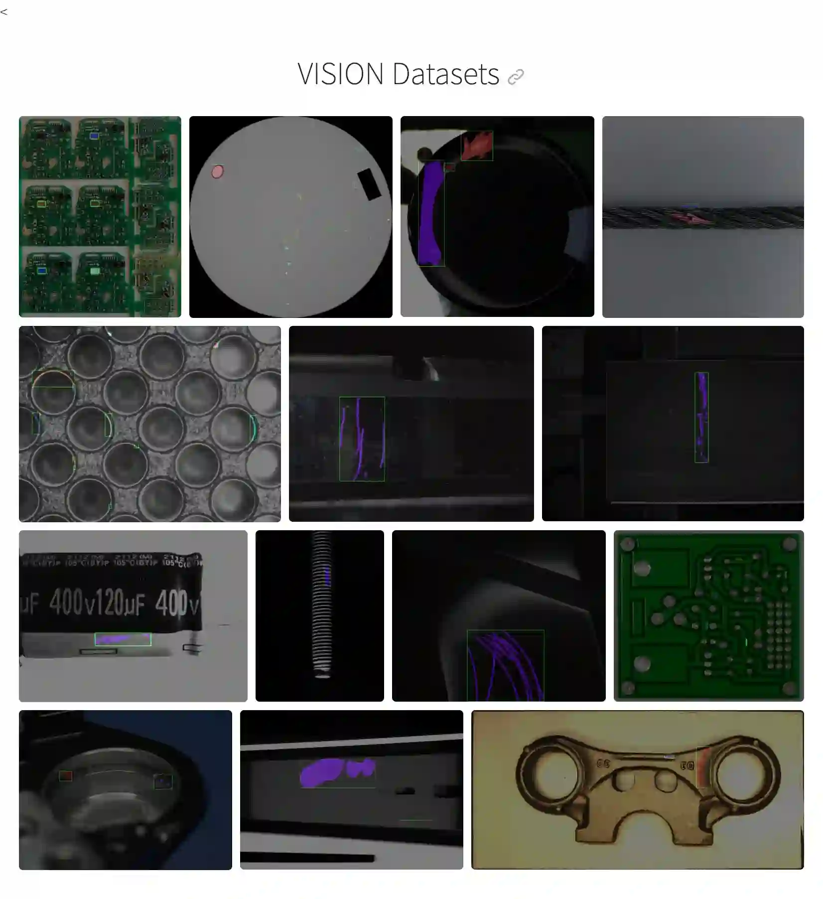 Despite progress in vision-based inspection algorithms, real-world industrial challenges -- specifically in data availability, quality, and complex production requirements -- often remain under-addressed. We introduce the VISION Datasets, a diverse collection of 14 industrial inspection datasets, uniquely poised to meet these challenges. Unlike previous datasets, VISION brings versatility to defect detection, offering annotation masks across all splits and catering to various detection methodologies. Our datasets also feature instance-segmentation annotation, enabling precise defect identification. With a total of 18k images encompassing 44 defect types, VISION strives to mirror a wide range of real-world production scenarios. By supporting two ongoing challenge competitions on the VISION Datasets, we hope to foster further advancements in vision-based industrial inspection.