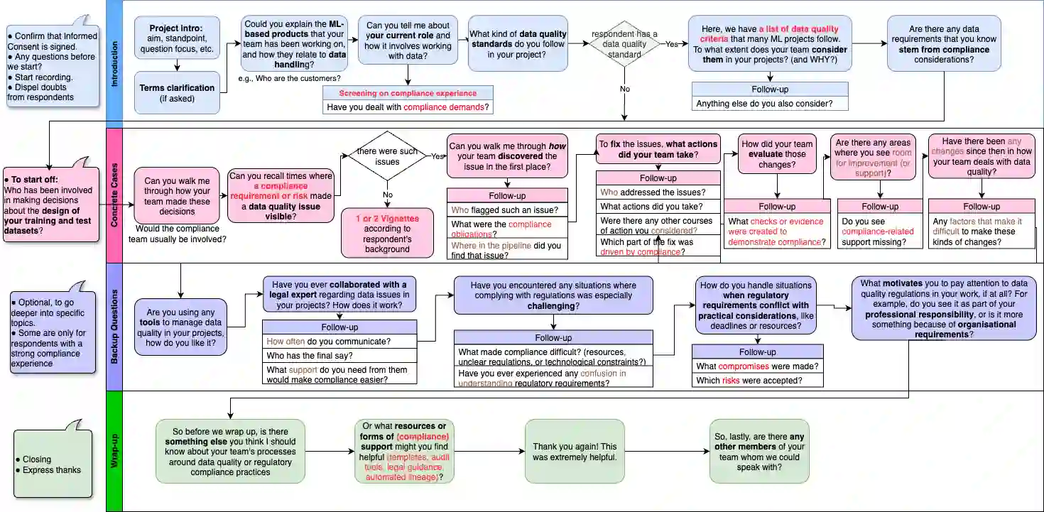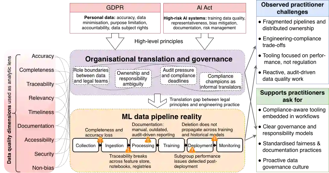 翻译:随着监管要求的扩展,确保机器学习(ML)系统中的数据质量变得日益复杂。在欧盟(EU),《通用数据保护条例》(GDPR)和《人工智能法案》(AI Act)等框架明确了与ML实践技术关切高度契合的数据质量要求,同时延伸至涉及问责制、风险管理和人权保护的法律义务。本文通过对在受监管环境中从事ML系统工作的欧盟数据实践者进行定性访谈研究。通过半结构化访谈,我们探究了实践者如何理解符合监管要求的数据质量、他们遇到的挑战以及他们认为必要的支持措施。我们的研究揭示了法律原则与工程工作流程之间持续存在的鸿沟、数据管道各环节的碎片化、现有工具的局限性、技术团队与法律团队之间模糊的责任边界,以及倾向于被动、审计驱动的质量实践模式。我们还识别出实践者对合规感知工具、更清晰的治理结构以及向主动数据治理文化转变的需求。