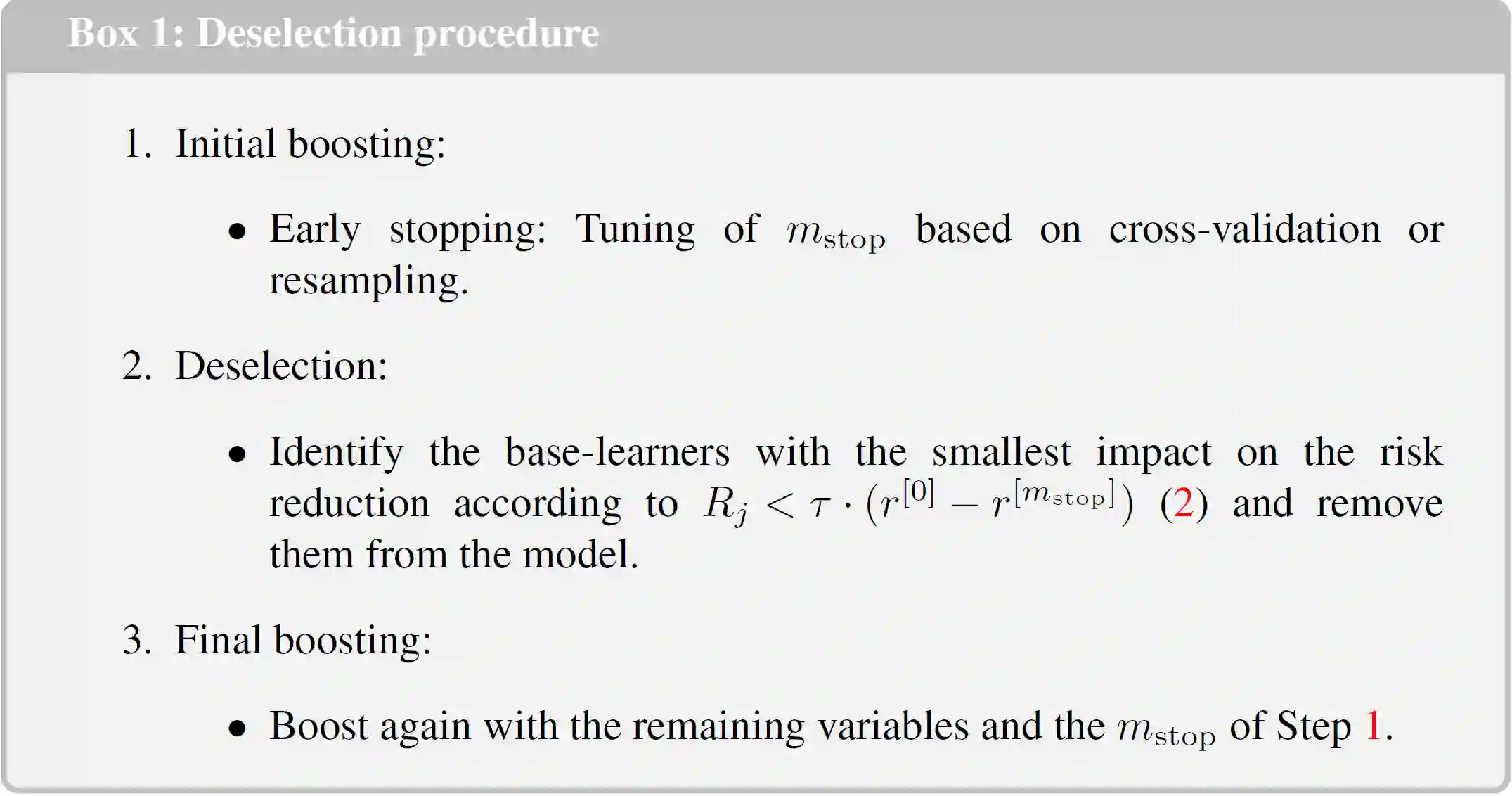 翻译:我们为组件梯度推升提供了一种强化变量选择的新程序。 统计推升是一种计算方法,它产生于机器学习,它使得回归模型与高维数据相容。 此外,算法可以导致数据驱动变量选择。 然而,在实践中,最终模型通常在某些情况下包含过多变量。 特别是在低维数据(p<n),我们观测到一种缓慢的超适应推升行为。结果,更多的变量在不改变预测准确性的情况下被纳入最终模型。许多这些假正数与一个小系数相融合,因此具有小影响,但导致一个更大的模型。我们试图克服这一问题,给算法提供机会去掉基本利器,但重要性不大。我们分析了新方法对变量选择和预测性能的影响,与替代方法相比,包括用较早的停止和双振来加速。 我们用当前对慢性肾病病人组群研究的数据来说明我们的方法, 与健康有关生命质量的最具影响力的预测器是在一个基于贝形回归的分布式回归法中选择的。