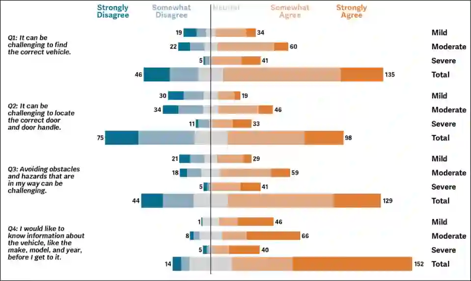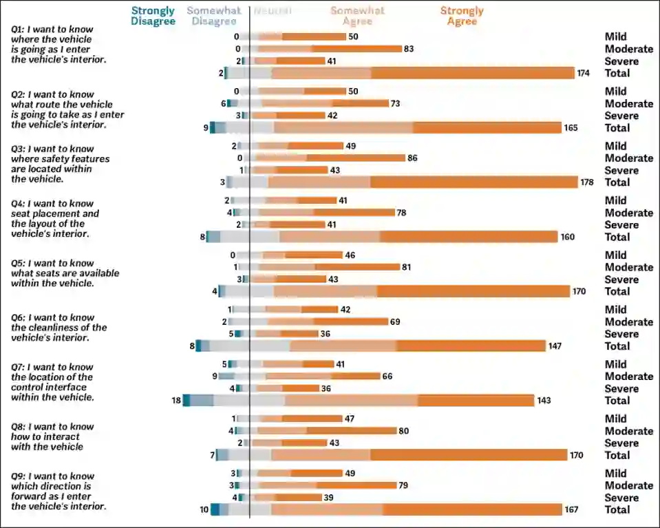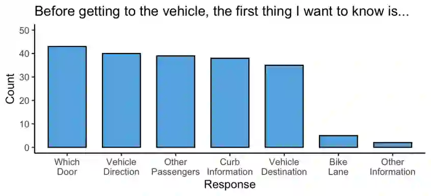 翻译:目的:自动驾驶车辆(AVs)正成为视障(BLV)旅行者一种前景广阔的交通解决方案,有望提供更大的独立出行能力。本文探讨了BLV用户在交通出行多个步骤中的信息需求,包括独立寻找并导航至车辆、进入车辆以及离开车辆。方法:一项针对202名BLV受访者的调查以及对12名BLV人士的访谈,揭示了BLV终端用户的观点,并明确了成功出行所需的自然语言信息序列。调查识别了三个出行阶段的关键信息需求,而访谈则帮助确定了如何将这些信息以一系列可访问描述的形式按优先级顺序呈现给旅行者。结果:综合调查与访谈发现,BLV用户在导航阶段优先关注了解车辆的制造商和型号以及如何找到正确车辆。他们同样强调在进入车辆时,获得关于车辆目的地和车载安全功能的确认信息至关重要。在离开车辆时,BLV用户重视关于危险和障碍物的信息,以及了解应从车辆的哪一侧下车。此外,结果突出表明,BLV旅行者希望使用自己的智能手机设备接收来自AVs的信息,并偏好基于音频的交互方式。结论:本研究的结果为向BLV用户提供出行相关信息贡献了一个结构化框架,有助于设计者为每个出行阶段定制自然语言描述。这项工作为在整个AV出行过程中序列化交通相关描述提供了重要贡献,最终将增强BLV个体的出行能力和独立性。