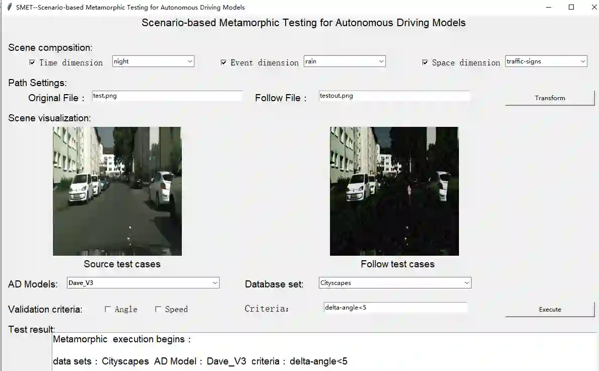 To improve the security and robustness of autonomous driving models, this paper presents SMET, a scenariobased metamorphic testing tool for autonomous driving models. The metamorphic relationship is divided into three dimensions (time, space, and event) and demonstrates its effectiveness through case studies in two types of autonomous driving models with different outputs.Experimental results show that this tool canwelldetectpotentialdefectsoftheautonomousdrivingmodel, and complex scenes are more effective than simple scenes.