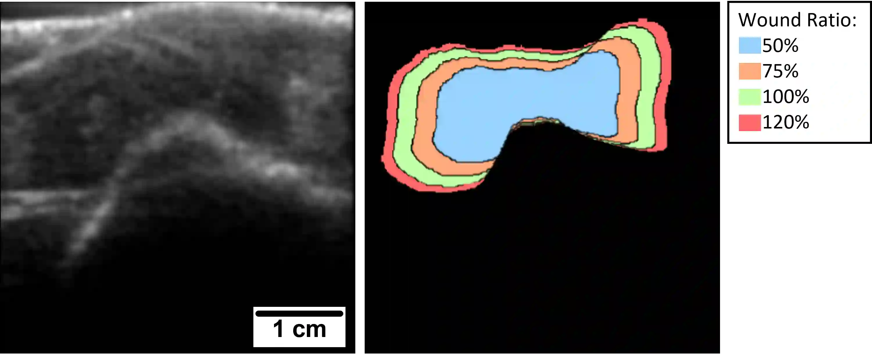 Chronic wounds including diabetic and arterial/venous insufficiency injuries have become a major burden for healthcare systems worldwide. Demographic changes suggest that wound care will play an even bigger role in the coming decades. Predicting and monitoring response to therapy in wound care is currently largely based on visual inspection with little information on the underlying tissue. Thus, there is an urgent unmet need for innovative approaches that facilitate personalized diagnostics and treatments at the point-of-care. It has been recently shown that ultrasound imaging can monitor response to therapy in wound care, but this work required onerous manual image annotations. In this study, we present initial results of a deep learning-based automatic segmentation of cross-sectional wound size in ultrasound images and identify requirements and challenges for future research on this application. Evaluation of the segmentation results underscores the potential of the proposed deep learning approach to complement non-invasive imaging with Dice scores of 0.34 (U-Net, FCN) and 0.27 (ResNet-U-Net) but also highlights the need for improving robustness further. We conclude that deep learning-supported analysis of non-invasive ultrasound images is a promising area of research to automatically extract cross-sectional wound size and depth information with potential value in monitoring response to therapy.