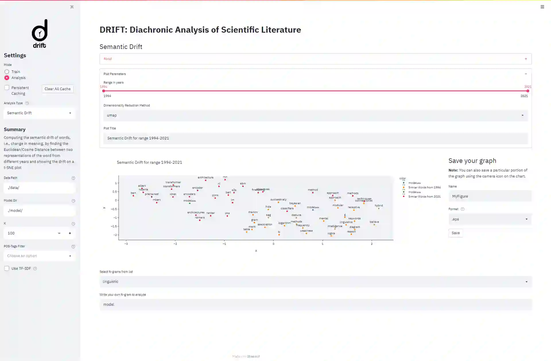In this work, we present to the NLP community, and to the wider research community as a whole, an application for the diachronic analysis of research corpora. We open source an easy-to-use tool coined: DRIFT, which allows researchers to track research trends and development over the years. The analysis methods are collated from well-cited research works, with a few of our own methods added for good measure. Succinctly put, some of the analysis methods are: keyword extraction, word clouds, predicting declining/stagnant/growing trends using Productivity, tracking bi-grams using Acceleration plots, finding the Semantic Drift of words, tracking trends using similarity, etc. To demonstrate the utility and efficacy of our tool, we perform a case study on the cs.CL corpus of the arXiv repository and draw inferences from the analysis methods. The toolkit and the associated code are available here: https://github.com/rajaswa/DRIFT.