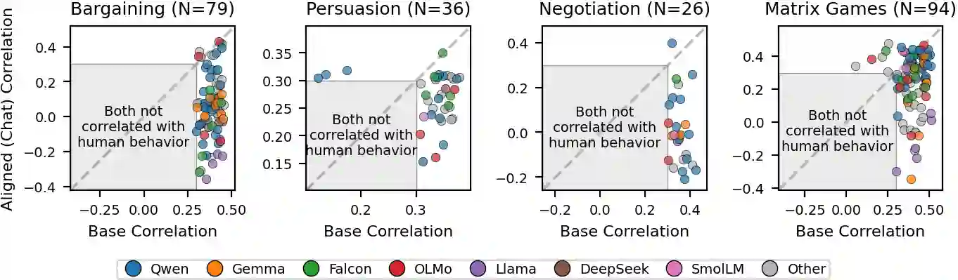 翻译:后训练对齐优化语言模型以匹配人类偏好信号,但该目标并不等同于对人类实际行为的建模。我们在多轮策略博弈(议价、说服、谈判及重复矩阵博弈)中,基于超过10,000条真实人类决策数据,比较了120组基础模型与对齐模型对。在这些场景中,基础模型在预测人类选择方面以近10:1的优势持续优于其对应对齐模型,该结果在不同模型族、提示词构建方式和博弈配置中均保持稳健。然而,在人类行为更可能遵循规范性预测的场景中,这种模式发生逆转:对齐模型在所有12种测试的单次教科书博弈及非策略性彩票选择任务中均占主导地位——甚至在多轮博弈内部的第一轮(交互历史尚未形成时)亦如此。这种边界条件模式表明,对齐会引发规范性偏差:当人类行为相对符合规范性解决方案时,对齐能提升预测性能;但在多轮策略场景中,当行为受互惠、报复及历史依赖适应等描述性动态机制影响时,对齐反而会损害预测准确性。这些结果揭示了优化模型以供人类使用与将其作为人类行为代理之间的根本性权衡。