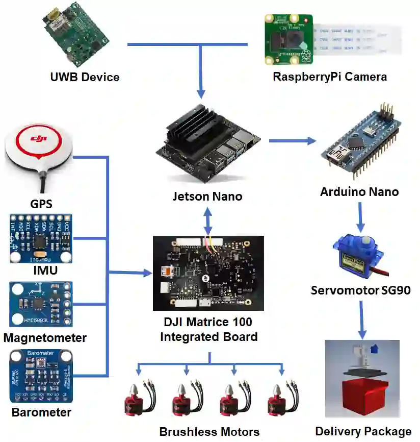 翻译:在着陆阶段,使用照相机、超广频带(UWB)装置的标记探测技术估计成份的信息,以及无人机的软件估算,通过使用扩展的Kalman过滤算法来提高着陆精确度,使无人机能够顺利地走所希望的道路,减少振动或可能损害运输包裹的严酷移动。 真正的实验验证了交付战略,并能够评价所采用的技术的性能。 初步结果说明我们关于自动无人机交付的建议的可行性。